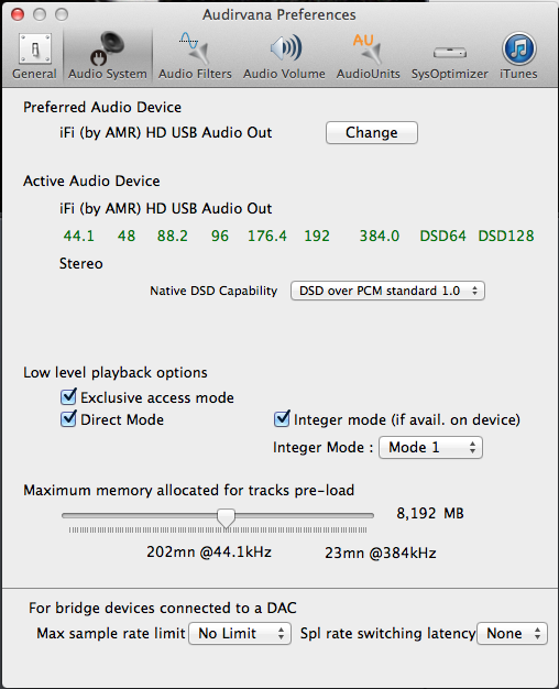 nano iDSDを接続後、ボリュームをまわして電源をいれます。そのあと、Audirvana Plusを立ち上げ、DACを選択、さらにDSDでDoPを選択すると、全ての周波数のフォーマットがグリーンになることを確認できます。これこそまさに全部入り! おもわず嬉しくなっちゃいますね。さらに最大までアップサンプリングする設定でいよいよ実際に鳴らしてみます。