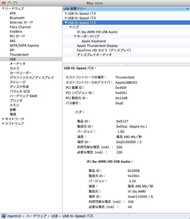 私の使用している機種はMac mini (Mid 2011)でUSB 2.0搭載のモデルなのでもともと問題はないのですが、最近のMacのUSB 3.0インターフェースはUSB DACとの相性がいまいち良くないことが知られています。しかしThunderbolt Displayは幸い(?)現在もモデルチェンジをしていないため、背面に搭載されたUSB端子は2.0のまま。しかもこのディスプレイ自体がホストアダプタになっているためMac本体がUSB 3.0の機種でも影響を受けません。またMac本体より当然ノイズも少なく安定した電源を供給できるため、nano iDSDのようにバスパワー稼働のUSB-DACを接続する端子としては最適でしょう。