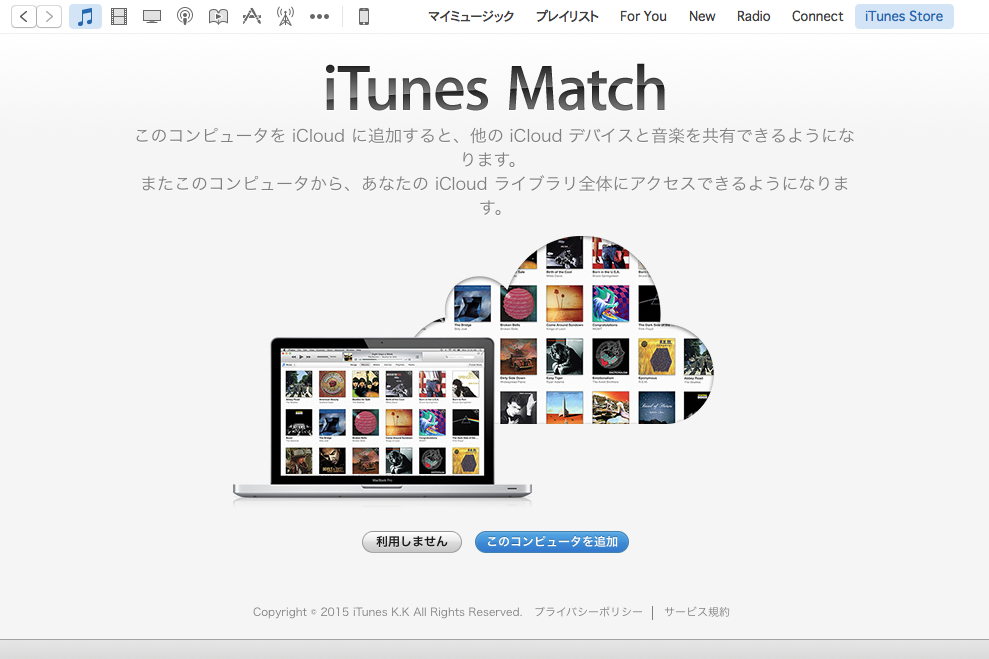 現在、iTunes Matchの項目はiTunes 12.2のメニューからはなくなりましたが、おなじ項目がiTunes Storeの「iTunes Match」にあり、サービスを契約する場合や、契約者がコンピュータを追加したり、実際にローカルの音楽ライブラリをiCloudとマッチ(およびアップロード)する場合も、ここの画面から行います。