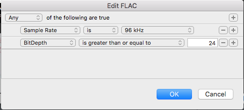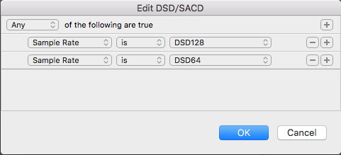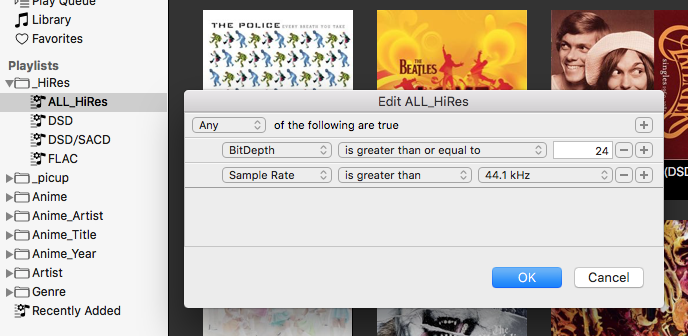 また、iTunesのライブラリ機能と同様に、Audirvana Plusにもプレイリストの作成・フォルダ分類の機能に加えて「スマートプレイリスト」の作成機能があります。スマートプレイリストでは曲データのフォーマットやビットレート、さらにさまざまなタグ情報で自動的にプレイリストを作成してくれます。私の場合は、アーティストごと、ジャンルごと、フォーマット(ハイレゾ、DSD)といった分類のスマートプレイリストを作成しています。
