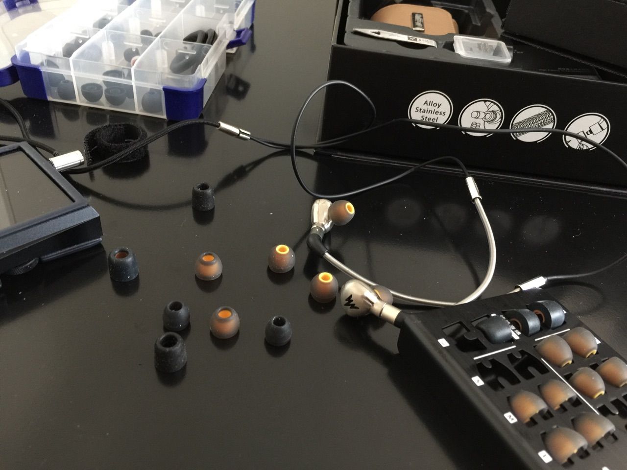 でも、シリコン製S/M/Lが2種類ずつ、さらに大小のウレタン製と、これだけイヤーピースがたくさんあれば。。。あれ、やっぱりしっくりこない。ならば手持ちのイヤピースをいろいろ。。。