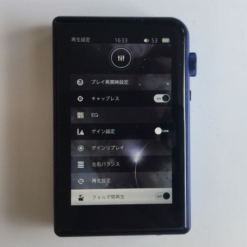 他に「再生設定」にある機能では、イコライザ機能(EQ)ではあらかじめプリセットで8パターンの設定が入っており、曲調に合わせて利用することができます。また個人的に便利なのは下の方にある「フォルダ間再生」で、上記のようにプレイリストを作成していない場合でも、フォルダ内の曲が最後まで行ったら自動的に次のフォルダを再生してくれる機能。私の場合は出張で新幹線の長時間移動が多いのですが、その場合に適当に流しておく、という使い方ができるので有り難いですね。