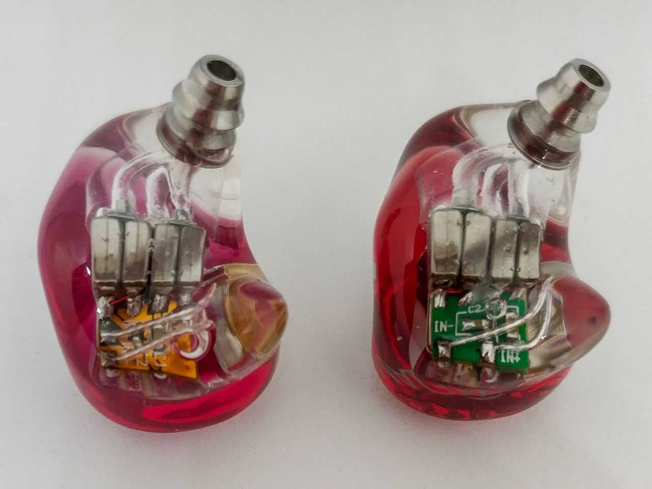 イヤホン本体はあらかじめケーブルに装着された状態でパッケージングされています。「Yinyoo H3」の赤青のカラーフェイスのクリアシェルと金属製のステムで構成された本体は非常にビルドクオリティの高いものです。また追加でオーダーした「Yinyoo H5」も同様のパッケージ構成でこちらも同様にクリアで非常に美しいシェルです。