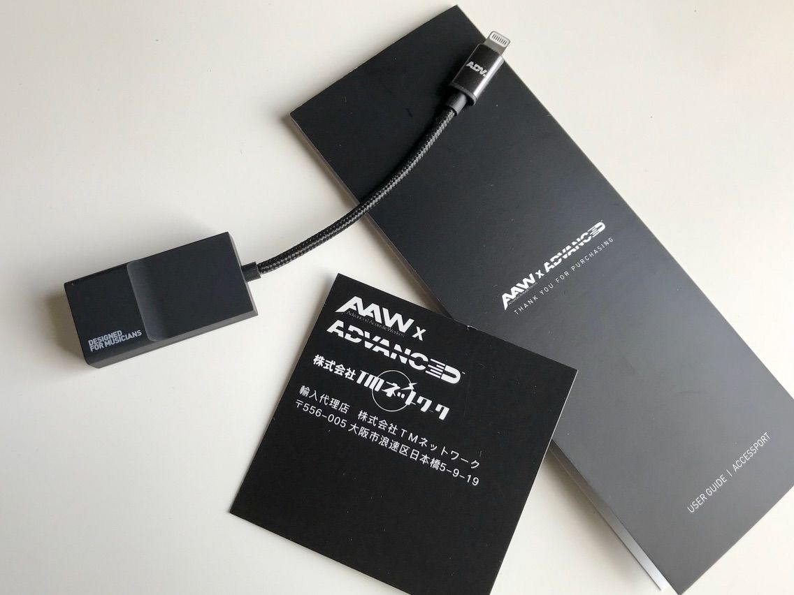 パッケージの内容は「AAW ACCESSPORT」本体、ユーザーガイド、国内版の保証書。本体は、凹凸のある方の面は「ADVANCED」、フラットのほうの面は「AAW」のロゴがLightningコネクタに記載されており、本体側もそれぞれの意匠が記載されたデザインになっていて、デュアルブランドの製品であることがわかります。