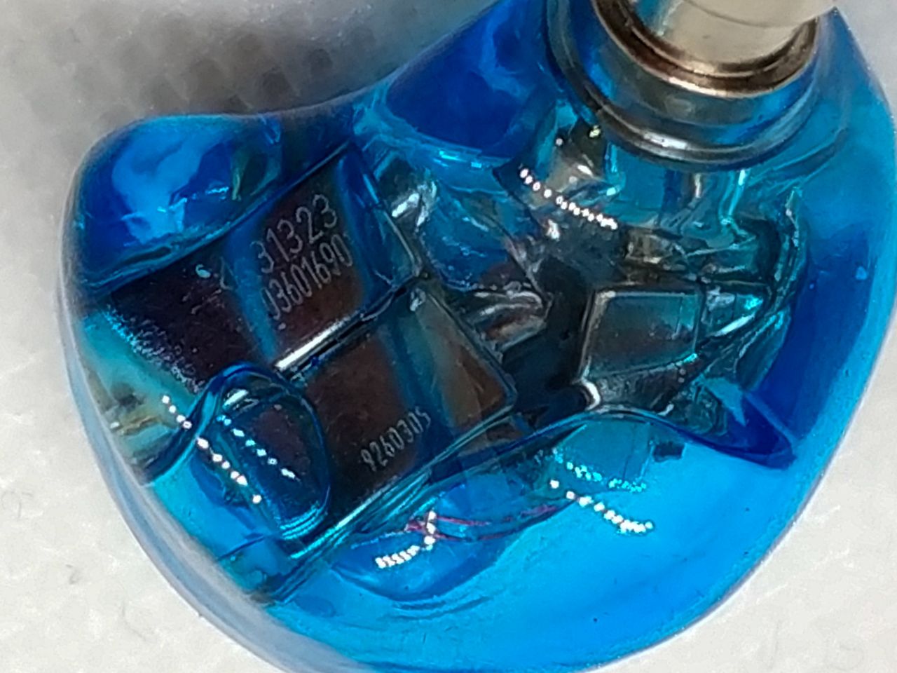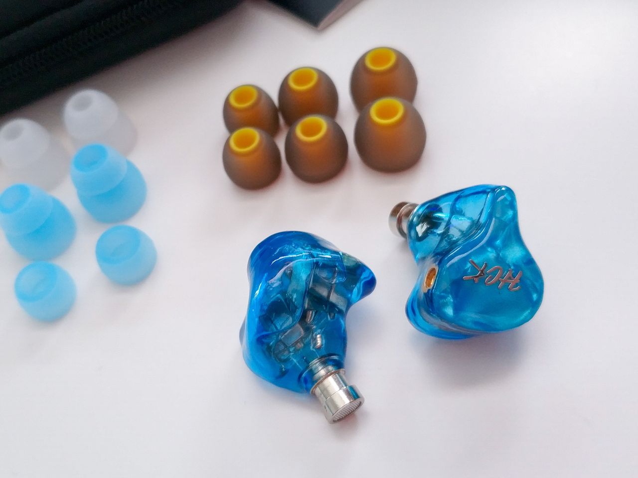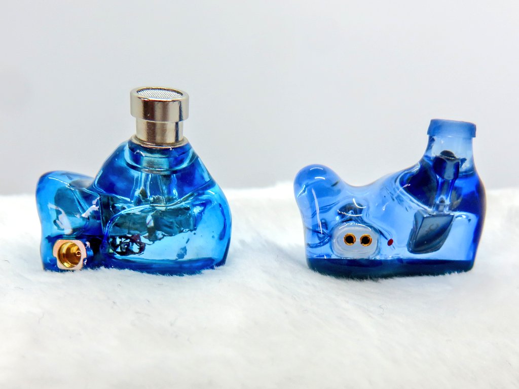 「NICEHCK HK6」の本体は、クリアブルーのハウジングに6つのバランスド・アーマチュア(BA)ドライバー(低域または中低域用デュアルBAが2種類+中高域用BA+高域用BA)がびっしりと収容されているのが確認できます。フェイスパネルはブルーマイカ(雲母)のプレートがデザインされています。