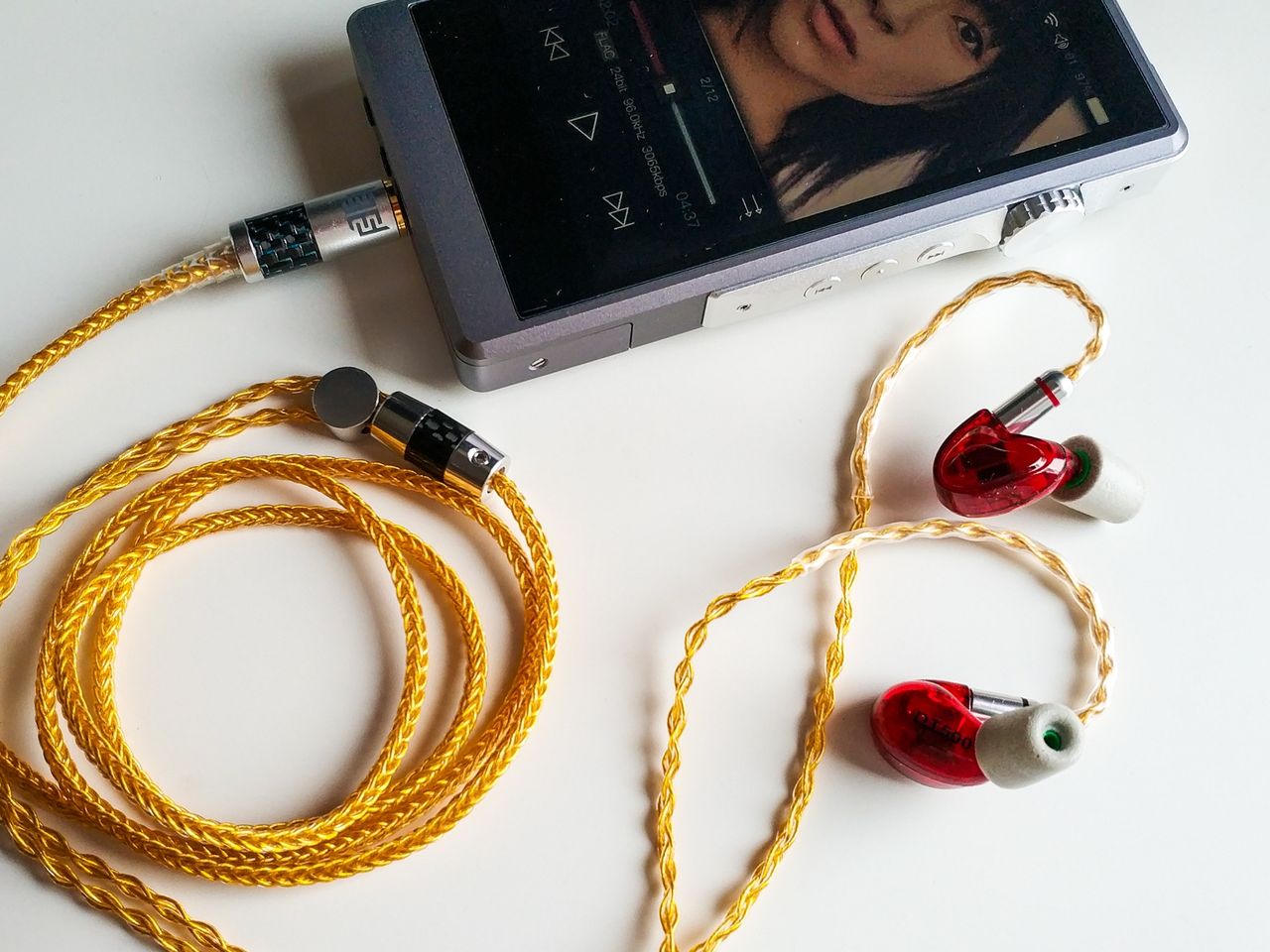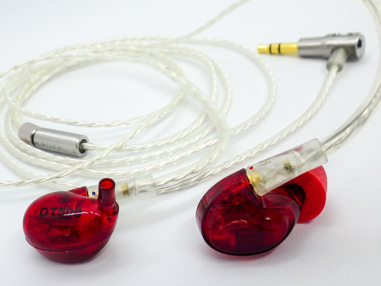100時間以上のエージングを実施した「DT500」で、イヤーピースは締まりを向上させるためコンプライ「P-100」を使用、さらにケーブルもHCKの8芯ケーブル(赤白ミックス)にリケーブルし、DAPは「iBasso Audio DX150」を使用して聴いた印象としては、オーケストラのサウンドトラックや、ブルーノート等のオールドジャズなどインストゥルメンタルの曲では中音域の籠りは比較的感じず、低域および高域の良さと響きを感じるサウンドを実感できました。いっぽうボーカル曲はポップス、ロック、アニソンなどジャンルを問わず全般的に籠りを感じる印象で、たまにピンポイントで大丈夫な曲がある、という感じでした。たとえばアニソンでは高域成分の強い「fripSide」の曲はわりと大丈夫ですが、同様に高域の強いボーカルでも「fhána」の曲は全般的に籠もる、という感じです。手持ちのケーブルで一番相性が良かったのは、HCKがAliExpressで以前から100ドル程度の金額で販売している金メッキ線ケーブル(本当に金メッキかどうかは不明)で、使用すると中低域のバランスが少し変ってしまうため普通に音の良いイヤホンでは逆効果になるケースも多いのですが、「DT500」の場合はボーカルが歌い上げるタイプの比較的音数の少ないポップス曲では印象が多少好転しました。