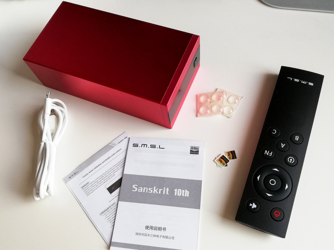 「SMSL Sanskrit 10th」は製品写真を掲載したボックスで届きました。パッケージ内容は本体、接続用USBケーブル、リモコン、説明書、保証書。リモコンの電池は付属せず、単4電池2本が必要です。