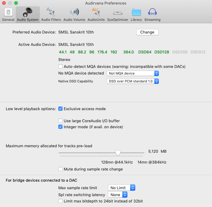 今回はMacに「SMSL Sanskrit 10th」を接続して定番の「Audirvana Plus」で聴いてみます。Windows環境の場合はメーカーサイトでドライバーをダウンロードしてインストールします(注意事項は後述)。Windows環境でのfoobar2000やJRMCなどでのASIOの設定方法はここでは割愛します。