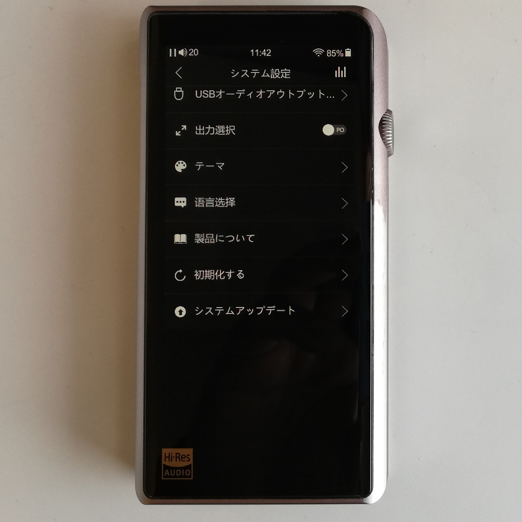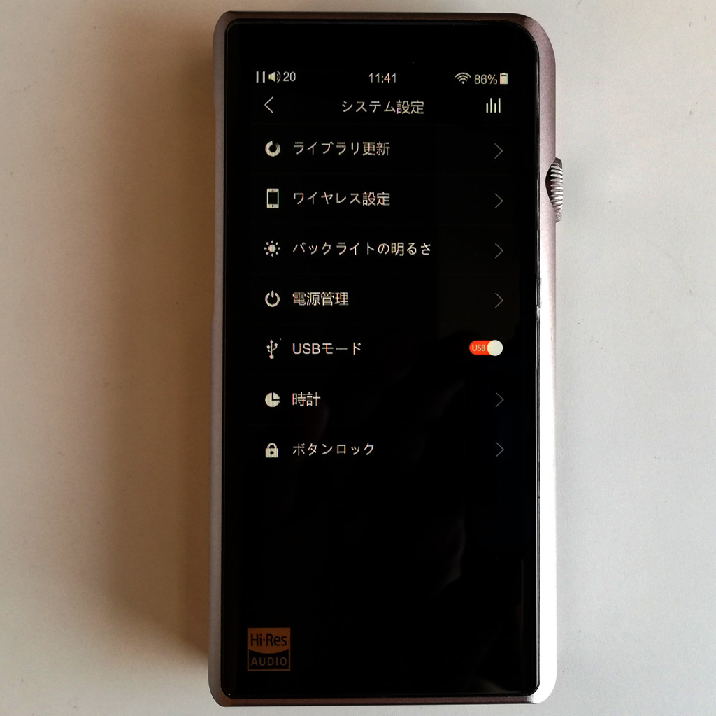 システム設定メニューでは各種モード設定などが行えます。「電源管理」ではスリープタイマーの設定、「USBモード」はPC/Macに接続時のマスストレージモードとDACモードを切り替えます。「ボタンロック」をONにすると画面オフのときのロック動作を設定できます(ロックのON/OFFはクイックメニューで変更可能)。その他ライン出力モードの変更や、USBトランスポート時の音量固定化の有無などがあります。