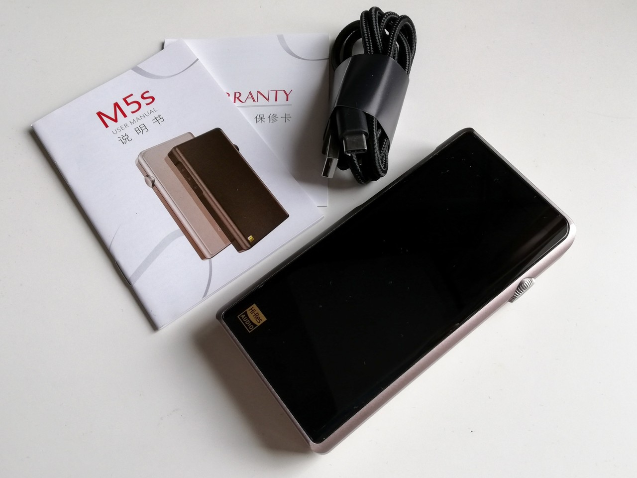 「Shanling M5s」のパッケージは日本語を含めた各国語の表記がされたボックスとなっています。付属品はシンプルで、本体、充電・データ転送用USBケーブル、説明書、保証書。といった内容です。