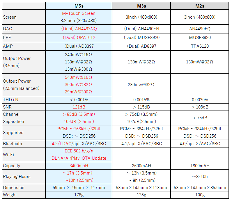 スペック面では全体的な向上が行われており、ダイナミックレンジやノイズ比はさらに高くなりました。またバランス出力での出力強化が行われているのが分ります。いっぽうタッチパネル(M-Touch 2.0)の採用で液晶パネルの解像度が従来までのRetina Screenではなくなった点はやむを得ない部分ですね。