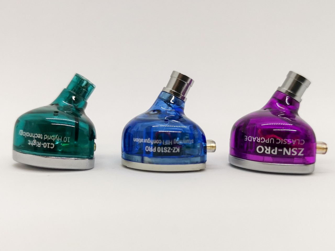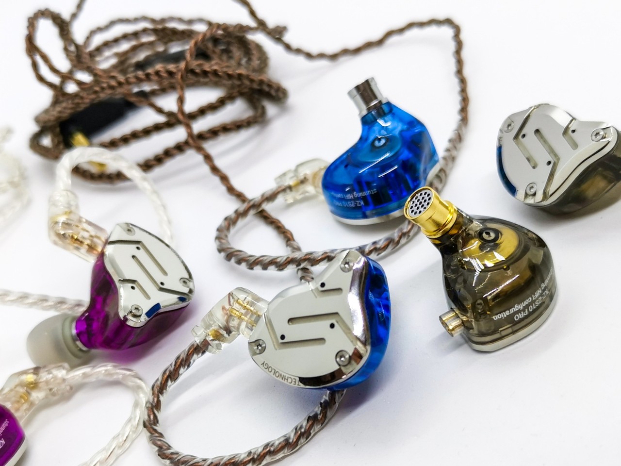 「KZ ZS10 Pro」カラーは「パープル」「ブラック」「ブルー」の3色。どれもクリアカラーのハウジングに光沢のあるメタルフェイスプレートのデザインとなっています。