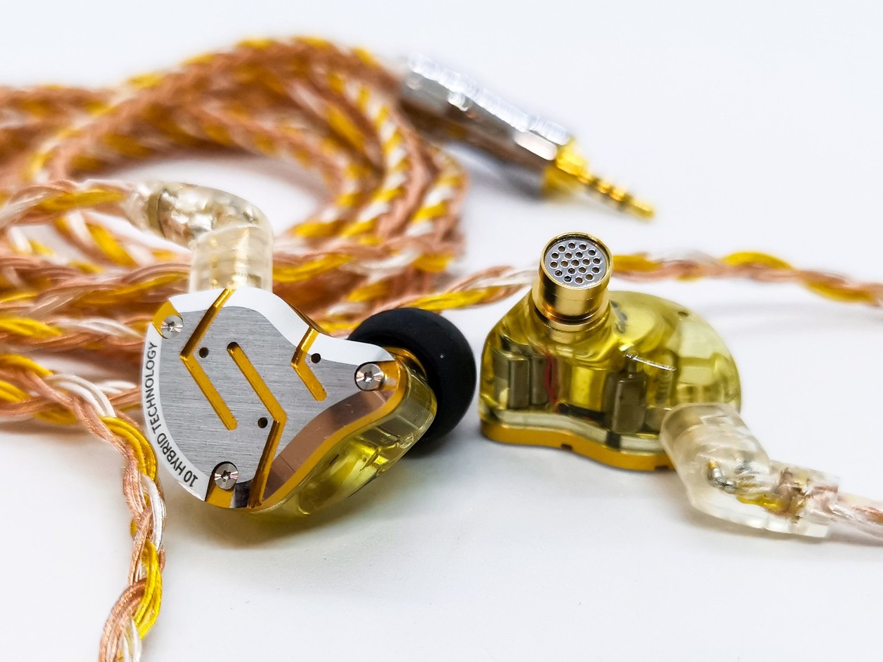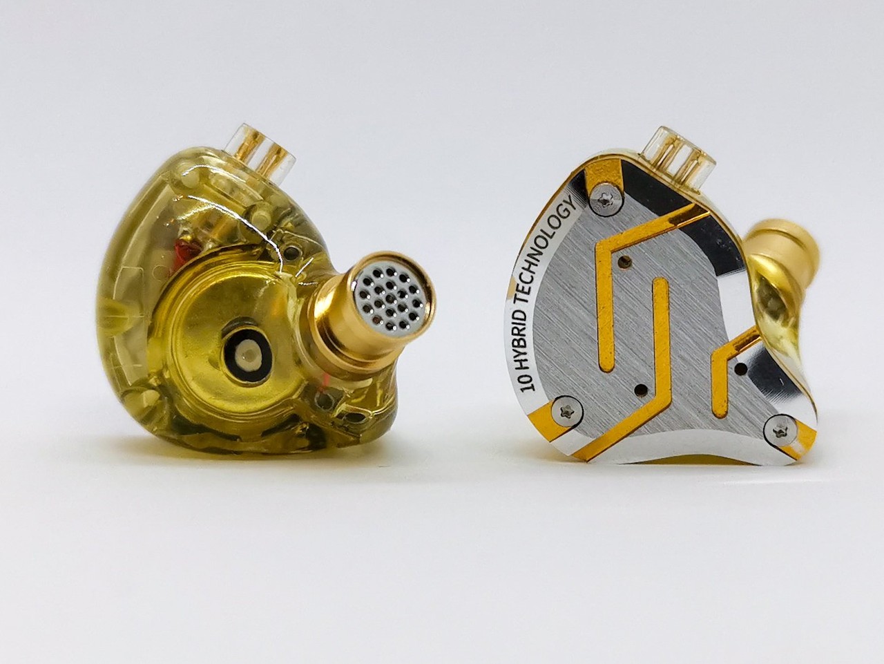 「KZ ZS10 Pro」本体は鏡面処理された金属製フェイスプレートにクリアカラーの樹脂製ハウジング、アルミ合金製のステムパーツで構成され、ケーブルのコネクタはよりしっかりと接続できる「KZ Cタイプ」を採用。