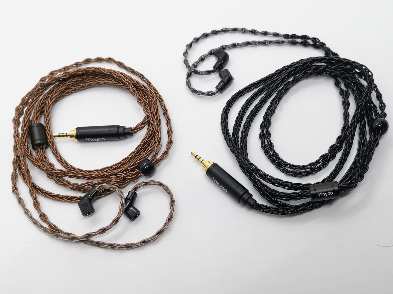 また銀メッキ線ケーブルでは、Yinyoo/HifiHear/Kinboofiの「HiF4848」「YYX4849」「HiF4850」「KBF4851」「YYX4853」の各ケーブルは基本的に「カラーバリエーション」で同じ線材ですので、組み合わせるイヤホンのカラーリングで組み合わせるのがよいですね。これらのケーブルでは8芯タイプよりさらに情報量が増加し、1枚空気の皮をめくったような明瞭感とキレの良さを実感できると思います。いっぽうでさらにイヤホンの反応がよくなるため、スマホなどノイズの多い再生環境ではホワイトノイズの可能性も高まりますので、8芯タイプとは再生環境なども考慮して選ぶと良いですね。