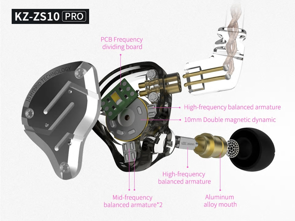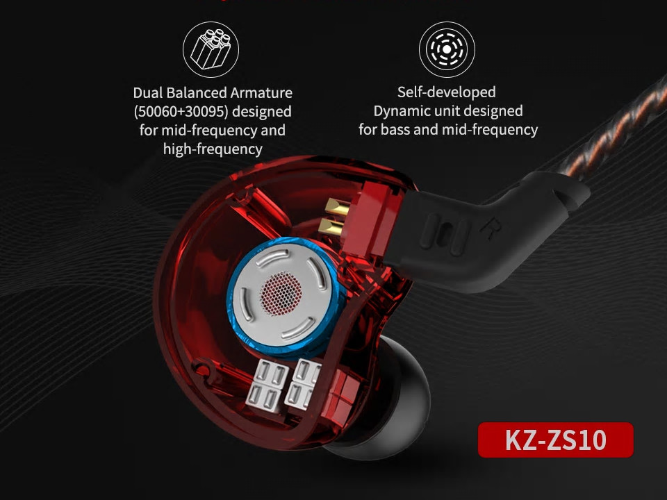 KZ ZS10 Pro : KZ 30095、 KZ 30095、 KZ 50060 ×2、 10mm二重磁気回路ダイナミック