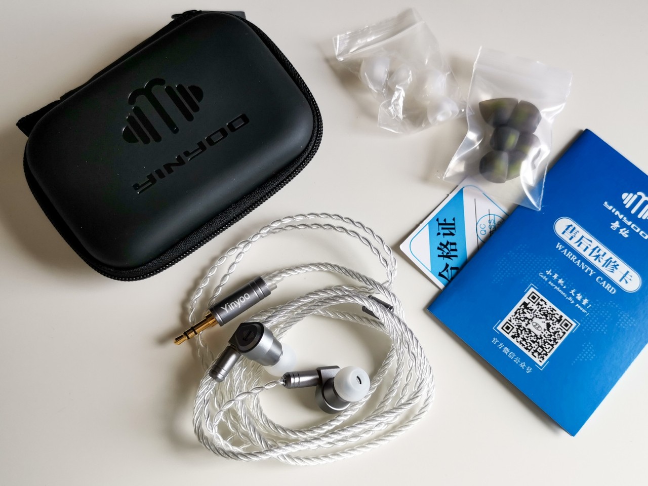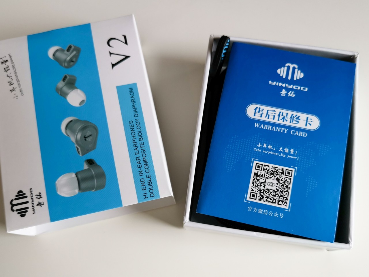「Yinyoo V2 (バージョン3 ・最終版)」のパッケージは製品写真が記載された「中華イヤホン」感あふれるデザインで、初期型の「Yinyoo V2」と同一のものです。パッケージ内容も同一で、Yinyooロゴのイヤホンケースの中に、本体、ケーブル、イヤーピース(白とグレーの2種類、それぞれS/M/L)が同梱されており、さらにブルーの保証書・説明書が付属します。