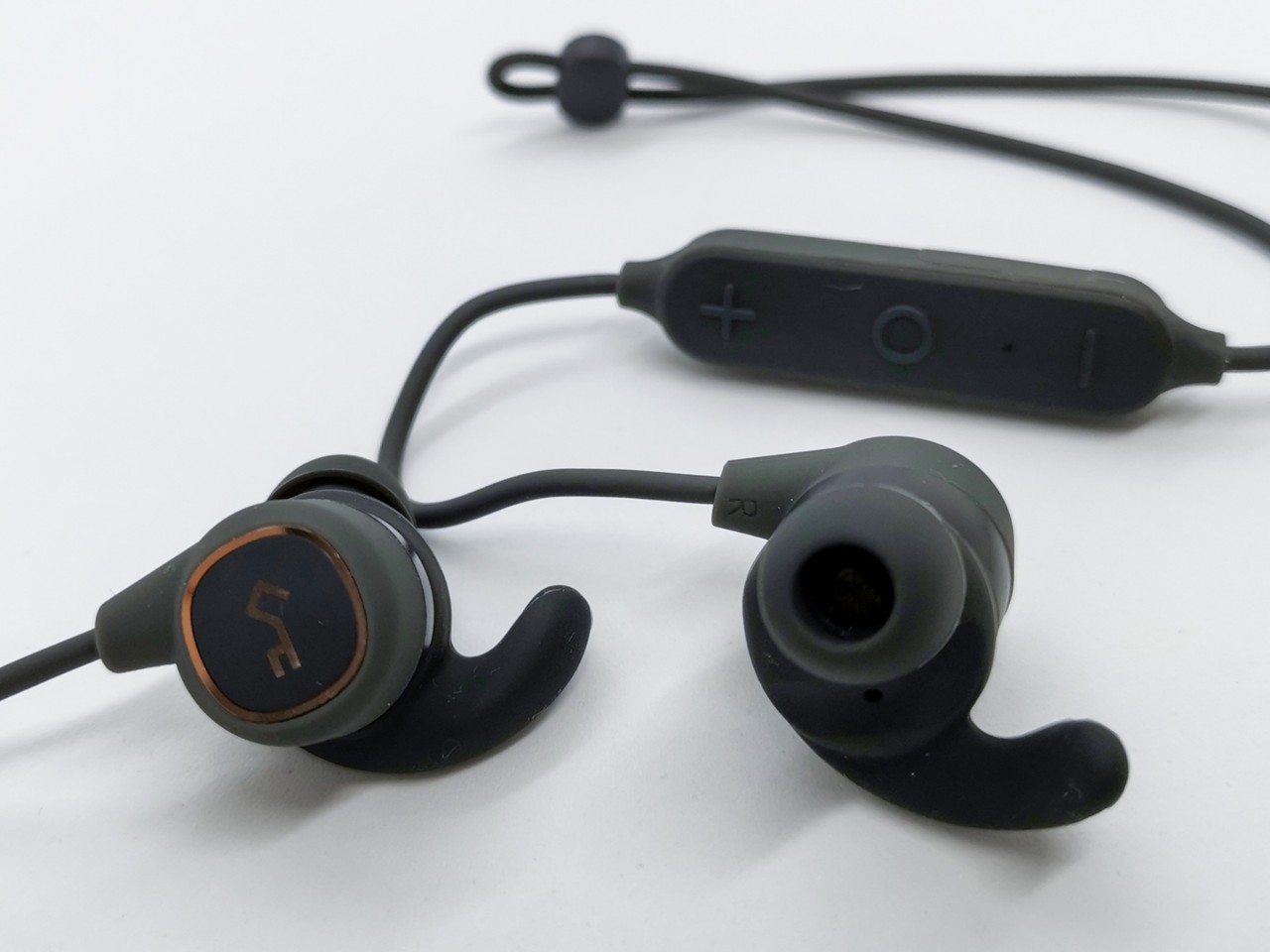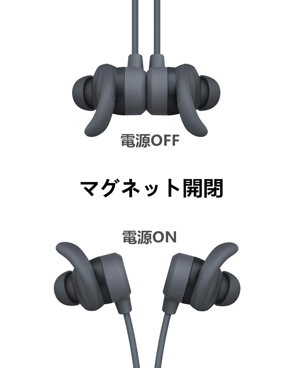 前述のとおり本体のフェイス部分がマグネットになっていて、この部分を左右くっつける、脱着することで電源のON/OFFになります。ペアリング時などは特にボイスメッセージはないようですね。操作性は非常に良くストレス無く使えるのはメリットでしょう。ただ細かい点ですが、ラバー製ケースは若干小さめのため、イヤホンを収納すると出し入れの際にマグネット外してしまったり同様にラバー被膜のケーブルが絡まったりとちょっと取り回しが不便な点は少し残念でした。