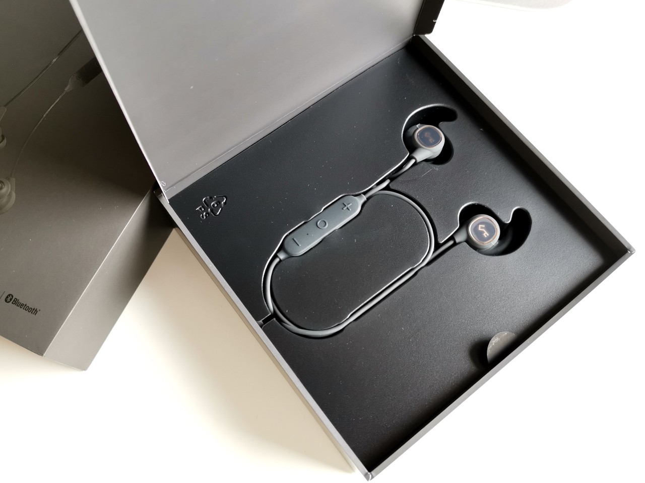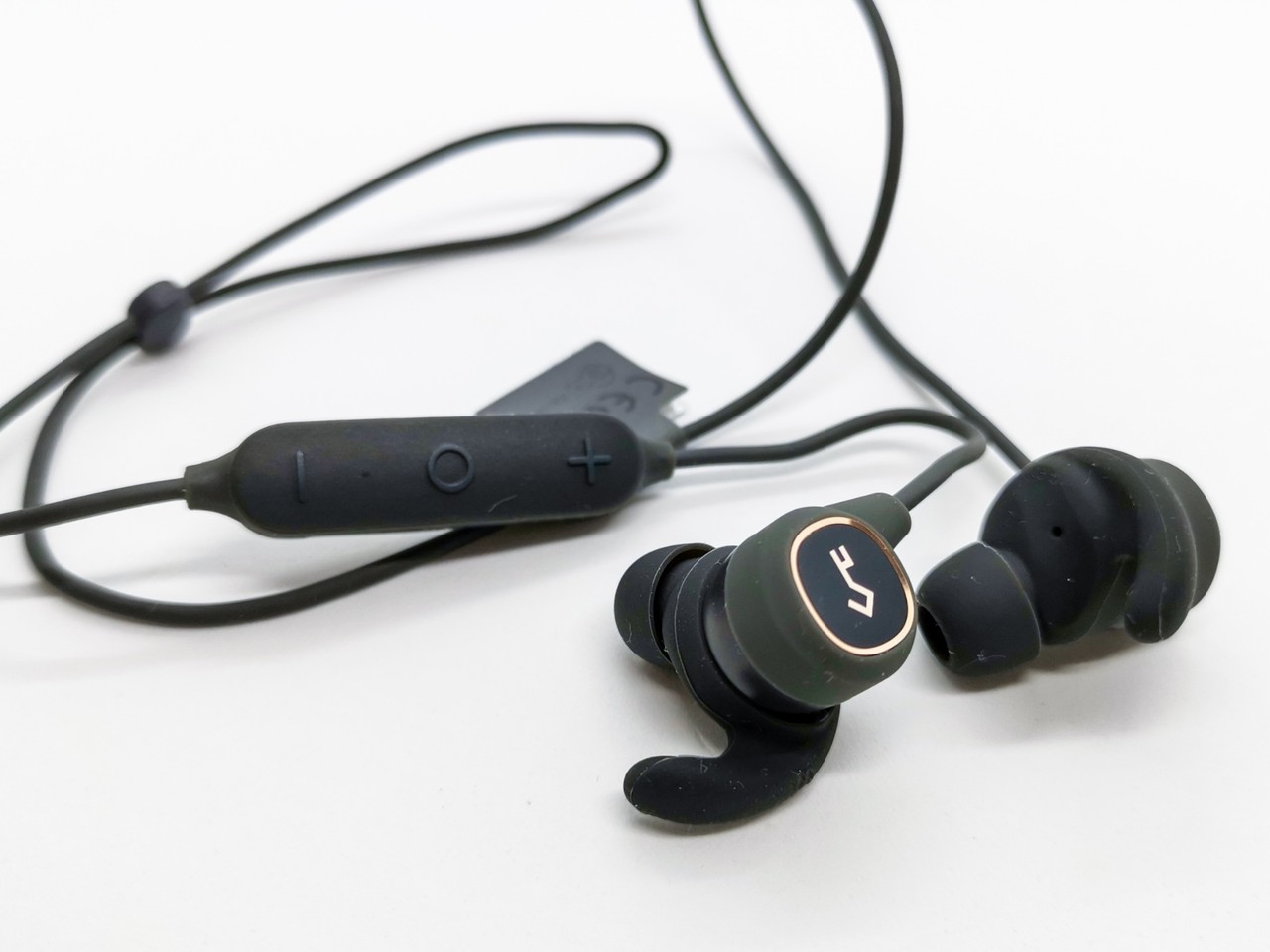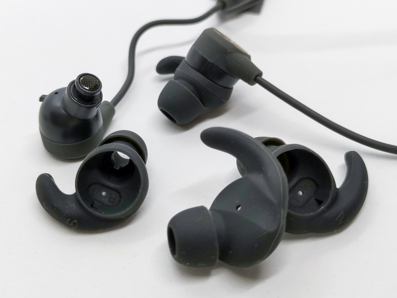 説明書は各国語表記で最後の方に日本語の表記もあります。イヤーピースは本体を覆うカバーおよびイヤーウイングが一体型になったもので、純正以外のイヤーピースを使用する場合、イヤーウイング部分が無くなります。16gと軽量でイヤーウイングによってフックする形状と言うこともあり装着性は高くマシントレーニングやジョギング程度の運動であれば落ちること無くしっかり固定できています。