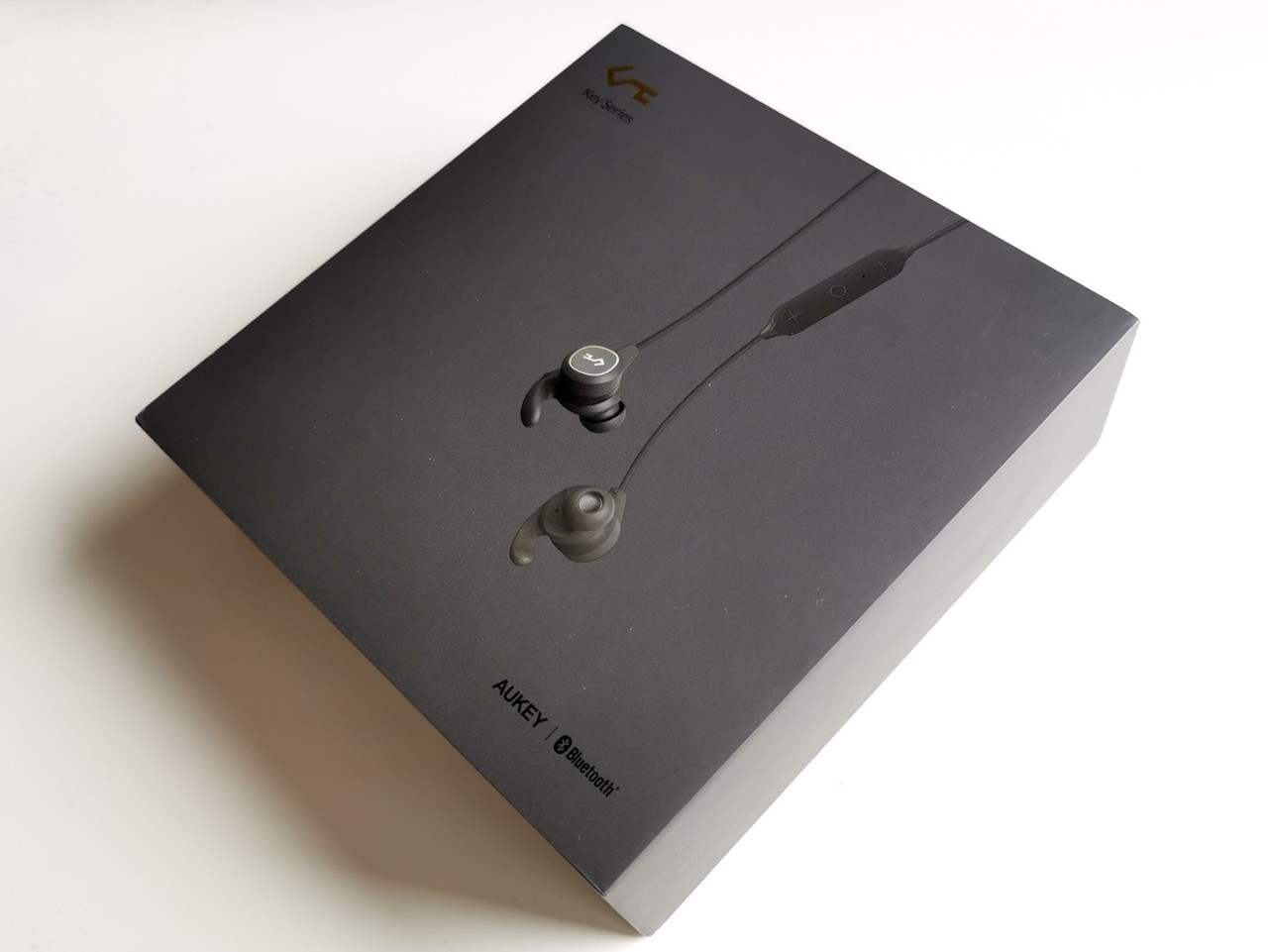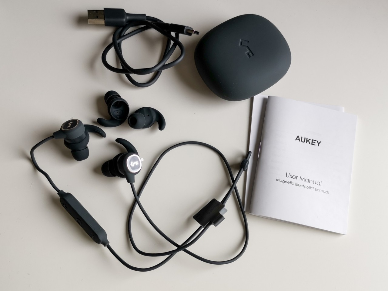 「AUKEY EP-B60」のパッケージはしっかりした化粧箱で、同社のイヤホンのなかでも比較的上位モデルであることを感じさせます。パッケージ構成はイヤホン本体、別サイズのイヤーピース、充電用ケーブル、ラバー製ケース、説明書、保証書。
