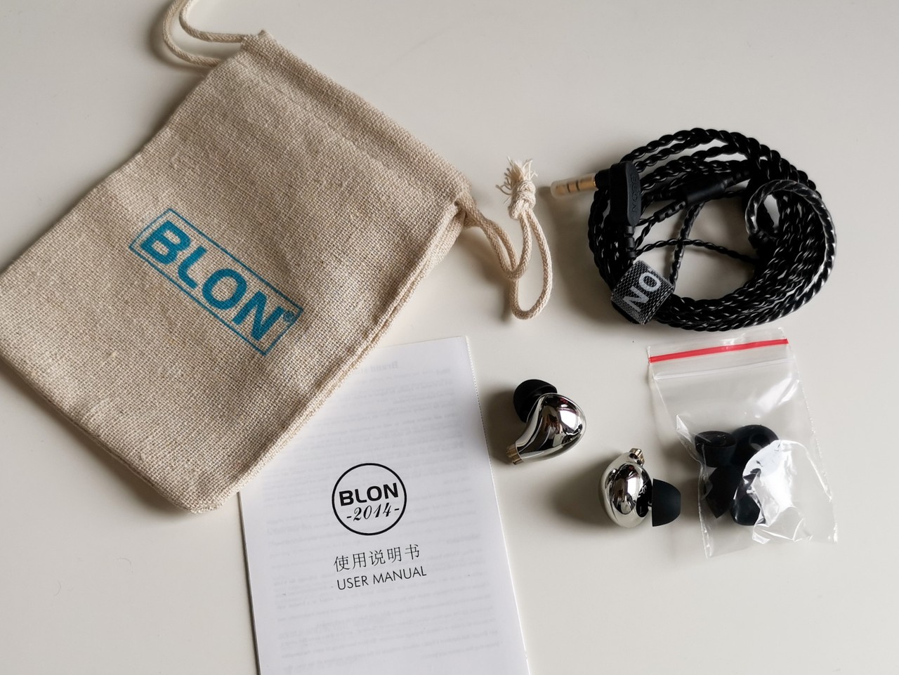 さてさて、開封前からパッケージデザインだけでひとしきり堪能したところで、「BLON BL-03」の内容ですが、本体、ケーブル、イヤーピース(S/M/Lサイズ)、布製ポーチ、説明書といった内容。