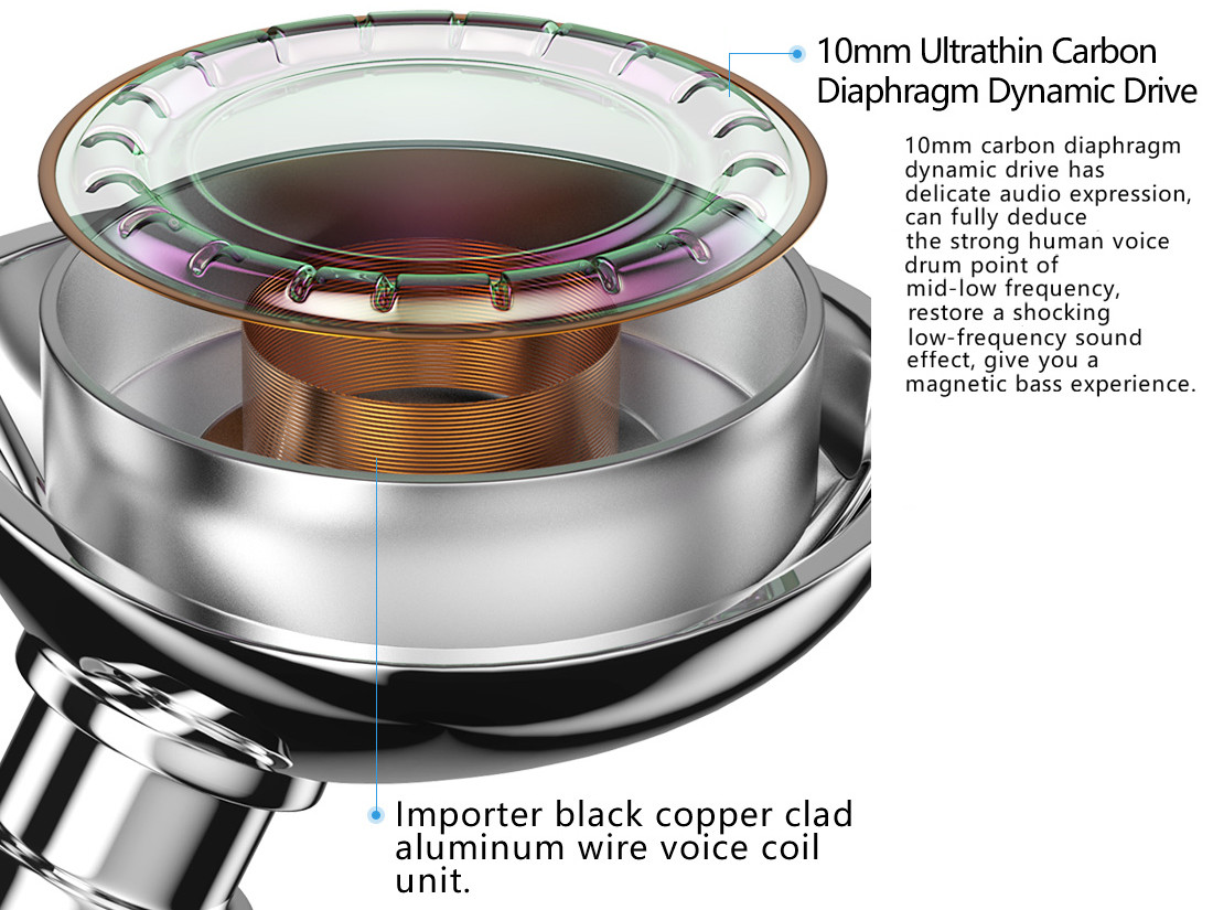搭載されているドライバーは 10mmサイズのカーボンナノチューブ振動板(ダイヤフラム)を採用した高音質ダイナミックドライバーをシングルで搭載しています。カーボンナノチューブ振動板というと、以前に比べ採用される製品も増えており、最近では中華イヤホンでもLZ系の「SEMKARCH」など時々見かけるようになってきました。カーボンナノチューブは非常に軽く高い剛性(アルミの半分の軽さで鋼鉄の20倍の強度)を持つ材質として知られており、通常の樹脂製ダイアフラムと比べより繊細さとキレの有るサウンドが特徴です。