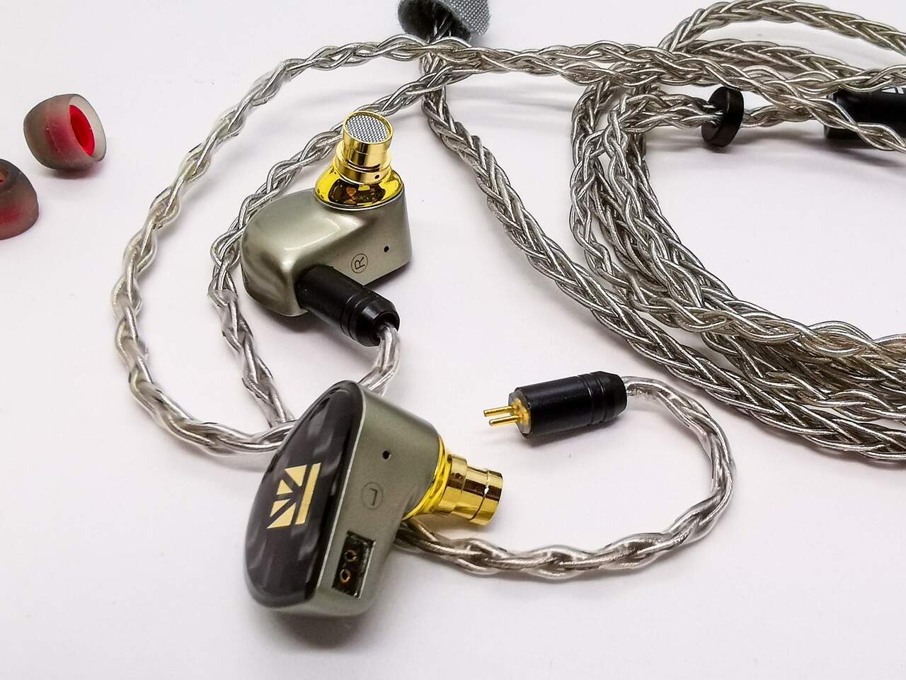 付属するケーブルは中華2pinタイプの8芯ケーブルで柔らかい線材のOFC(無酸素銅)銀メッキ線ケーブルで取り回しも良好です。プラグやコネクタ、分岐部分のパーツにはKBEARブランドの低価格帯のケーブル製品と同じ金属製のものが使用されています。「KBEAR Hi7」の付属ケーブルよりしっかりしたもので、リケーブル無しでも十分に使えるクオリティのケーブルが付属するのはうれしいですね。