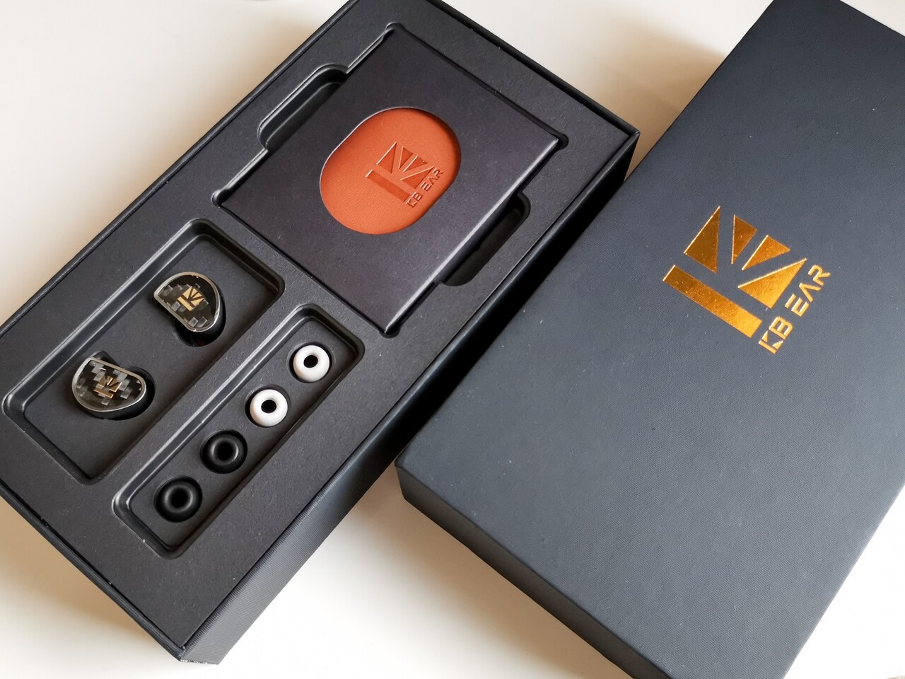 「KBEAR Diamond」のパッケージは新しいデザインのボックスで、「KBEAR Hi7」などで採用されている最近のEasy系のイヤホンのパッケージより大きく豪華さを感じるものです。従来タイプのパッケージではフェルト生地の布製ポーチが付属しましたが、「KBEAR Diamond」ではSIMGOT製イヤホンのような革製のしっかりしたケースが付属しています。
