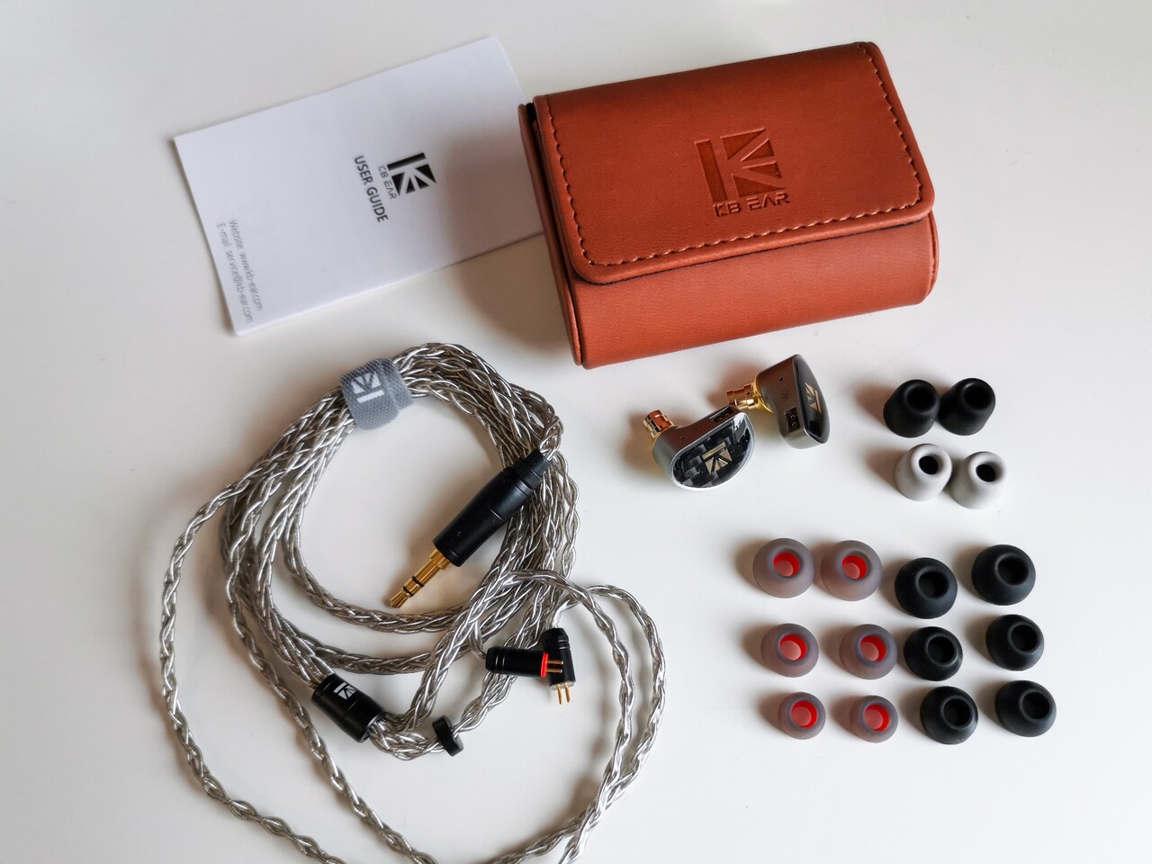 パッケージ内容は、イヤホン本体、8芯銀メッキ線ケーブル、イヤーピースはグレーとブラックの2種類のシリコン製(各S/M/Lサイズ)、ウレタン製イヤーピースもブラックとグレーがそれぞれ1ペア、革製ケース、説明書。