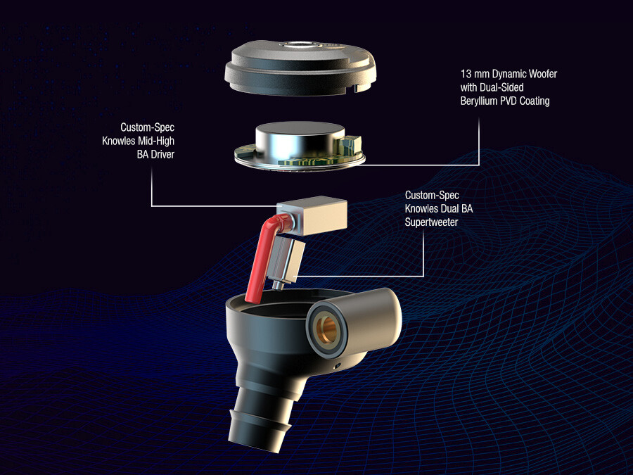 「DUNU DK2001」は現行モデルの「DUNU-TOPSOUND」のハイブリッド製品のなかでは最もローエンドに位置づけられる製品で日本国内でも3万円台の価格設定が魅力的なモデルです。しかしその内容に妥協は無く、バランスド・アーマチュア型(BA)ドライバーはKnowles製カスタム仕様で明瞭感の高い中高域用ユニットと、伸びの良いデュアル仕様のツィーターユニットを搭載。さらに低域用には両面ベリリウムコーティング振動板の13mm 大口径ダイナミックドライバーが搭載されています。これらのドライバーは人間工学に基づいたデザインで配置され最適な音像表現と音場感を提供しています。
