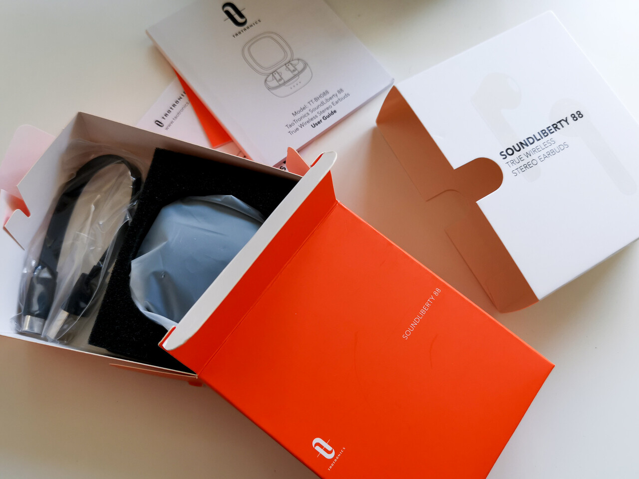パッケージ内容には、「SoundLiberty 88」イヤホン本体、充電ケース、充電ケーブル(USB Type-C)、マニュアルなどが含まれます。マニュアルは複数の言語で記載されており、もちろん日本語でも書かれています。日本国内での技適も正式に取得している製品ですし、初めて購入される方も安心ですね。