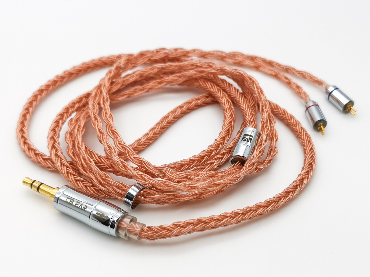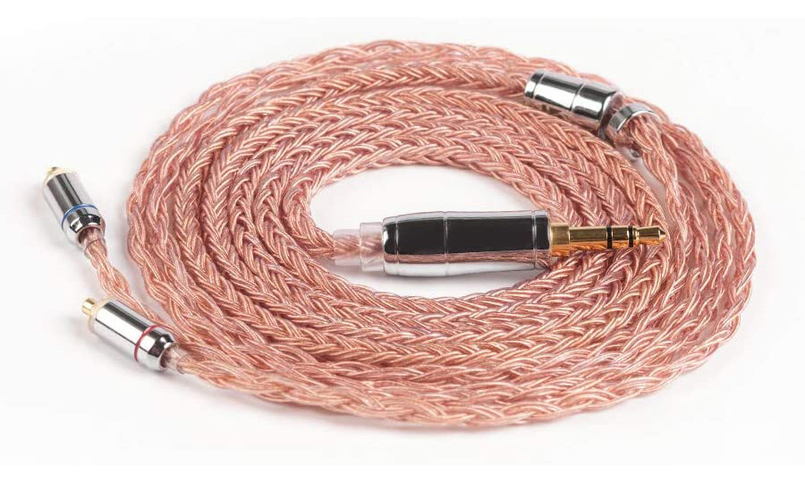 KBEAR「KBX4880」は銅線カラーの16芯銀メッキ線ケーブルです。高純度銅線ケーブルのようにも思えるカラーリングですが、AliExpressでの記載によると銀メッキの無酸素銅(OFC)ケーブルのようですね。非常にしなやかなケーブルで、ミドルグレードらしくコネクタ部品などもクロームメッキ仕上げとなっています。またKBEARブランドでも低価格タイプの16芯ケーブルのような耳掛け加工はなく、耳掛けタイプでも垂らすタイプのイヤホンでも使用が可能です。
