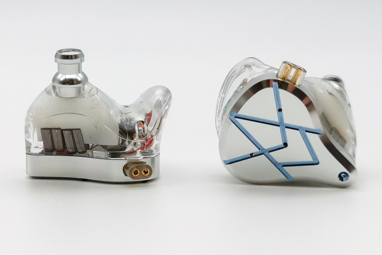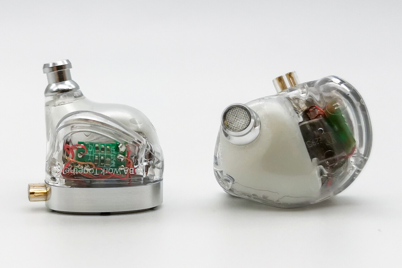 この強烈な存在感のあるハウジングでは、10基のBAユニットが比較的余裕を持って搭載されているのが分ります。また各ユニットの出力を制限するネットワーク基板も大きめのものが使用されています。もしかすると今後このハウジングで12BAまたはそれ以上のユニットを搭載した上位モデルも想定した設計なのかも知れませんね。