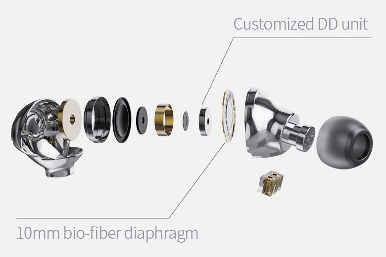 「BLON BL-01」の本体は亜鉛合金製のハウジングで、カラーリングはガンメタルと鏡面処理されたクロームシルバーの2色が設定されています。「BL-03」ではCNT(カーボンナノチューブ)だったのに対し、「BLON BL-01」ではバイオファイバーの振動版を採用した10mm サイズの独自ダイナミックドライバーをシングルで搭載します。