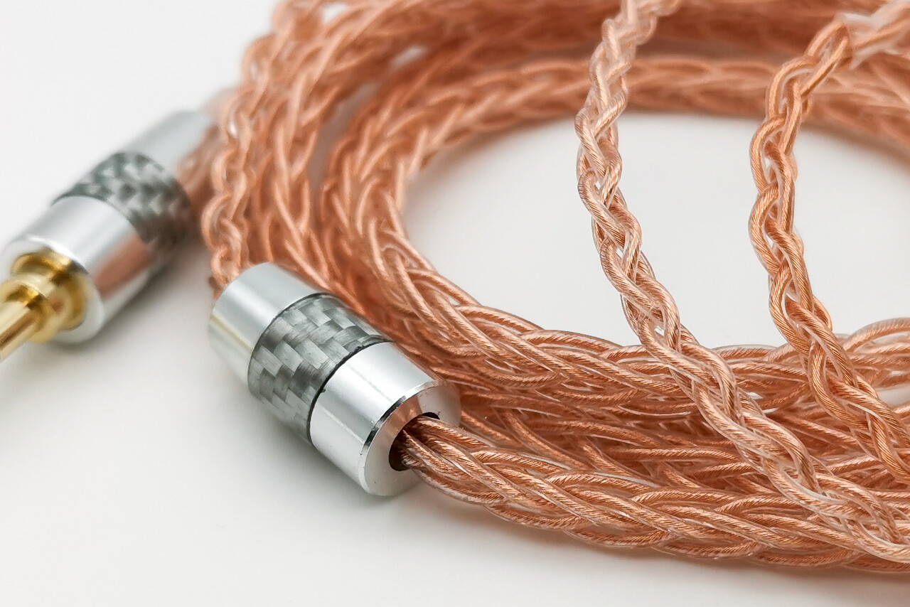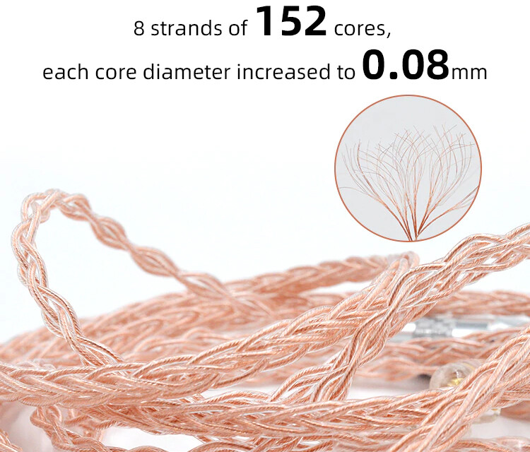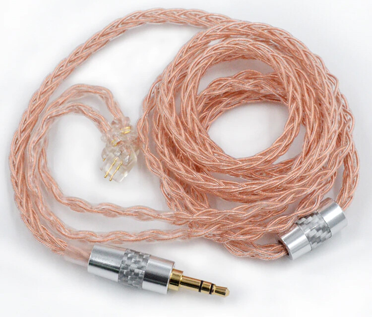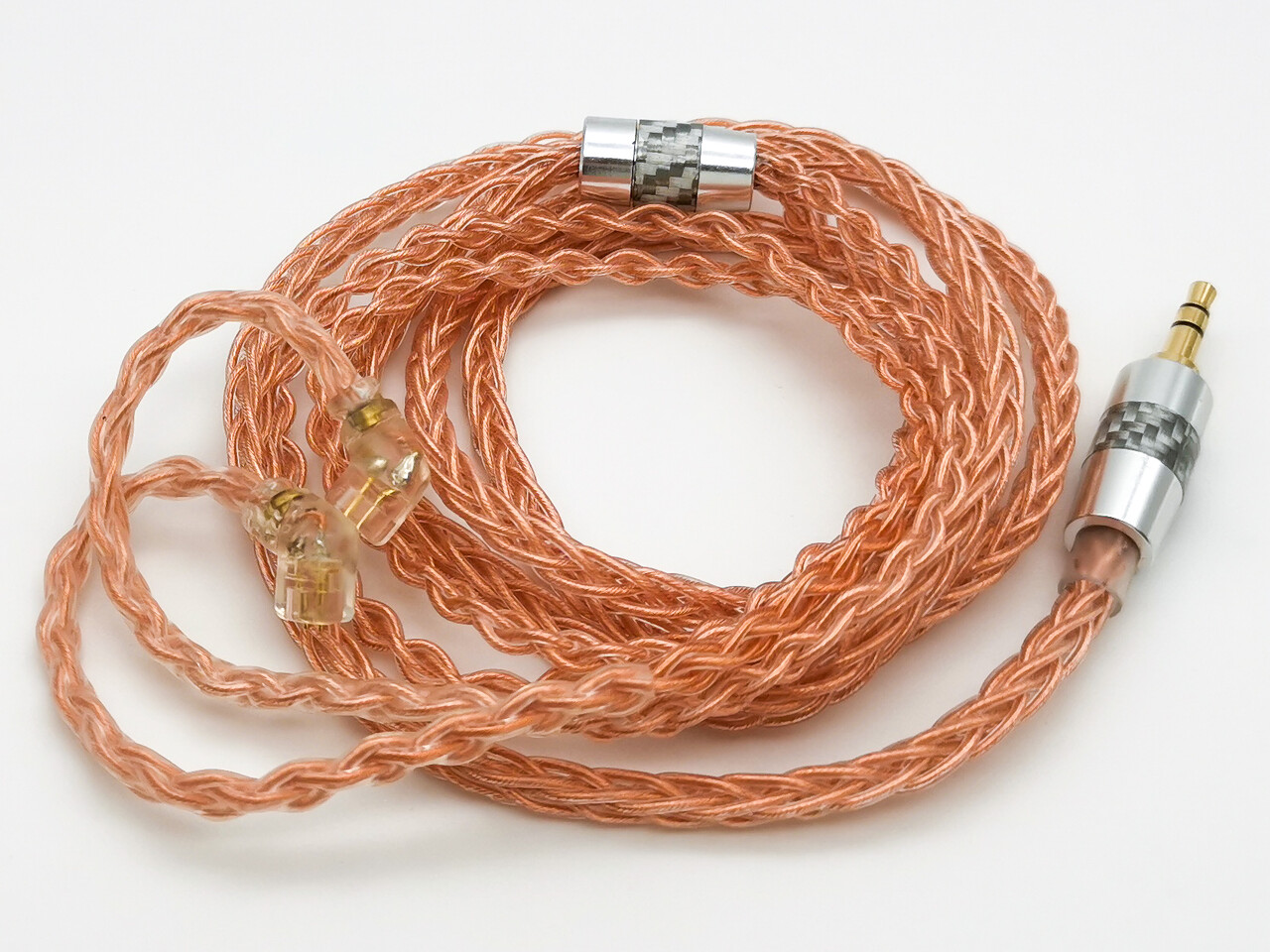 そして、「KZ 8 Core OFC Upgrade Cable」は今回紹介しているケーブルの中のベースとなる高純度無酸素銅(OFC/Oxygen Free Copper)ケーブルとなります。芯材ごとに高純度の銅線を透明な被膜で覆った銅線色のケーブルですね。芯材あたり0.08mmの線材を19本束ねて構成し、これを8本編み込んだ8芯ケーブルで、合計152本の線材が使用されています。価格もAliExpressでは10ドル以下の設定となっています。