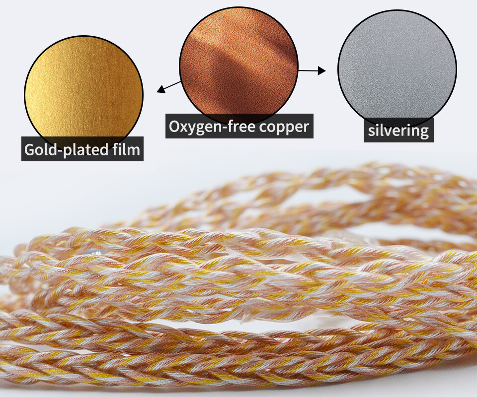 KZの新しいアップグレードケーブルは、ベースとなる「高純度無酸素銅(OFC)線ケーブル」を含め、4種類のケーブルをリリースしています。「KZ Gold Silver and Copper Mixed Upgrade Cable」は、高純度無酸素銅(OFC/Oxygen Free Copper)線と、この銅線に加えて、銀メッキ銅線、さらにゴールドメッキフィルムを定着した金メッキ銅線の3種類の線材を使用したミックス線の8芯ケーブルとなります。編み込まれた8本の芯材は、1芯あたりこの3種類の線を合計7本使用し、それぞれの線材はさらに14本の線材で構成されています。つまり芯材あたり98本、8芯合計では784本の線材で構成されたケーブルとなります。