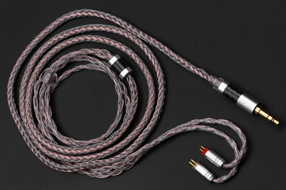 実際のケーブルはグレーとカッパーピンクの線材を編み込んだ2色混合線で、おそらくカッパーピンクの方の芯線が銅線タイプ、グレーの方がグラフェン合金線と銀メッキ線の混合線タイプでこれを8本ずつ編み上げたケーブルかな、という印象です。以前レビューした「TRIPOWIN Zonie」および多くの16芯線同様に非常に柔らかいケーブルで、細い線をしっかり編み上げているため、様々なサイズや形状のイヤホンと組み合わせ印象です。
