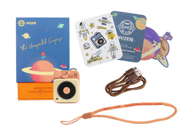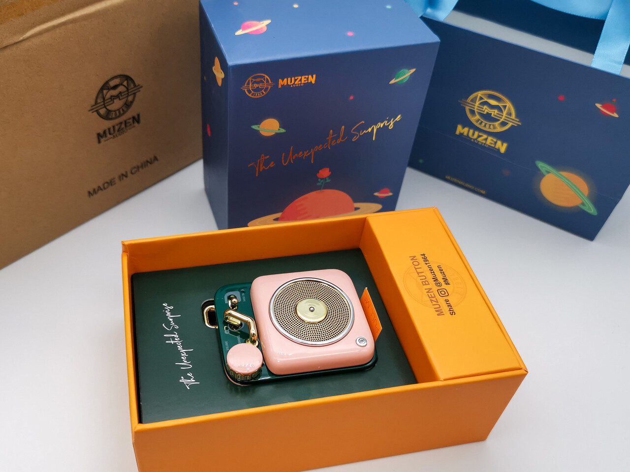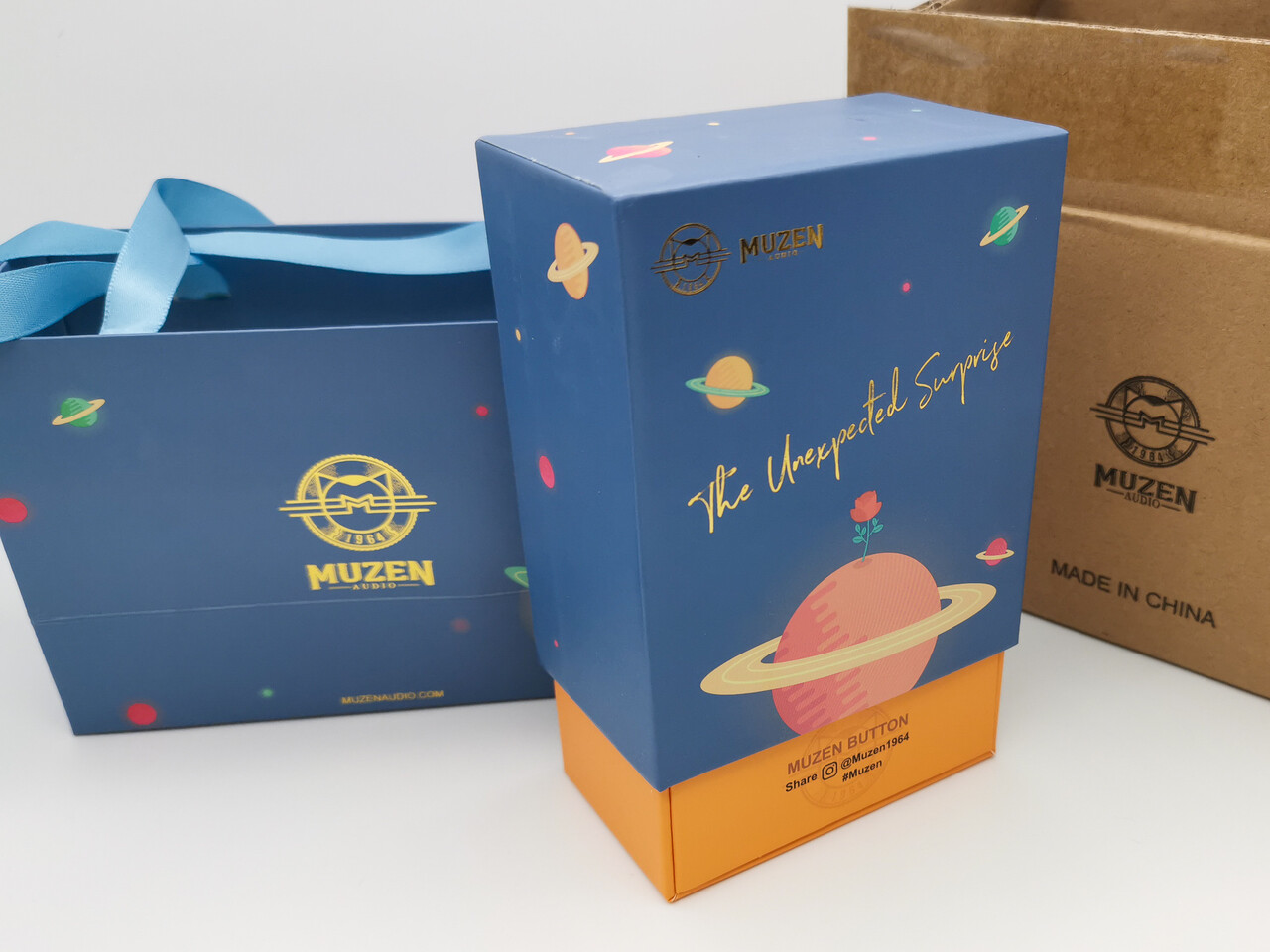 「MUZEN BUTTON」のパッケージは届いた段ボールの箱を開けると専用のギフトバッグ(紙袋)に入っており、まさにプレゼントを意識した統一感のあるデザインにまとめられています。またMUZENオリジナルシール、USBケーブル、携帯ストラップなどのBUTTON専用の付属品が同梱されているのも特徴ですね。