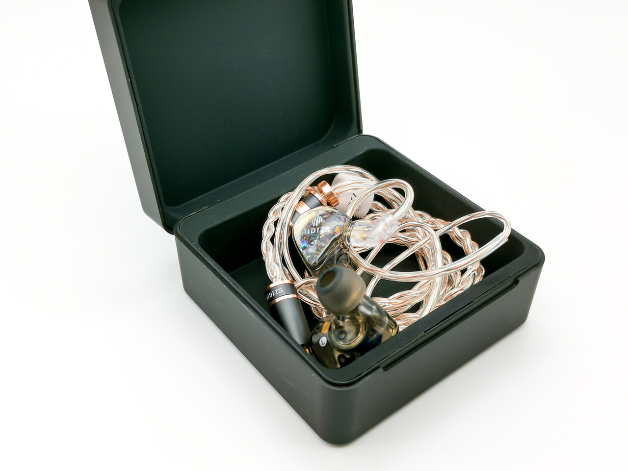 本体はカラフルな植物由来の軽量樹脂ボディと蓄光フェイスプレートを使用。ケーブルは4芯タイプの高純度銀メッキ線および高純度銅線によるミックス線ケーブルが付属。またメタルプレートをあしらった丈夫な収納ボックスが付属するなどアクセサリーも充実しています。