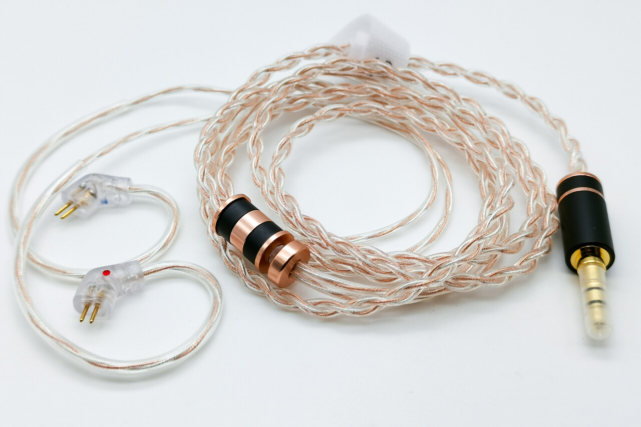 ケーブルは銀メッキ線2芯と高純度銅線2芯のミックス4芯タイプ。左右に分けて2芯ごとに被膜で覆われています。プラグや分岐部分は金属製で高級感がありますね。細めのケーブルで適度に柔らかく取り回しは良好です。