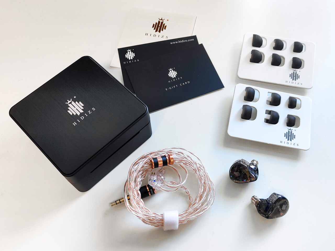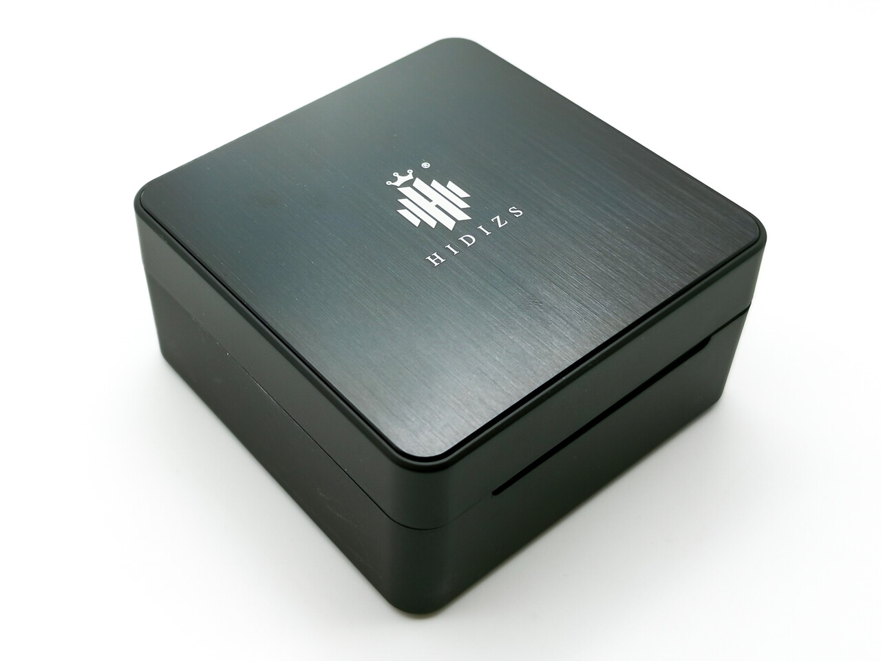 「Hidizs MS2」のパッケージはキューブ型のボックスで内容はイヤホン本体、ケーブル、イヤーピースは開口部が大きいタイプ・小さいタイプでそれぞれS/M/Lサイズ、ハードケース、説明書、保証カードなど。