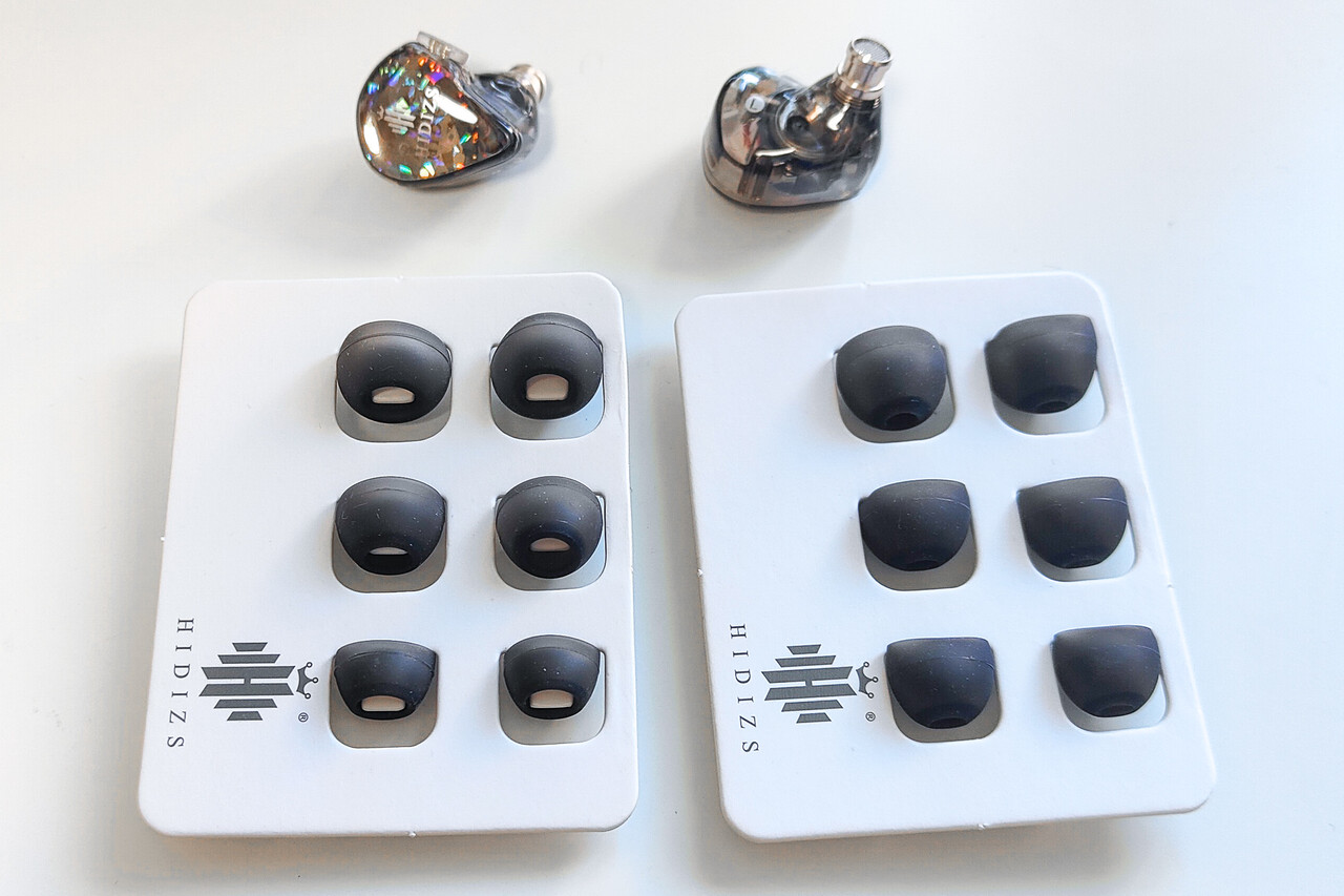 イヤーピースは開口部の大きいタイプ、小さいタイプで各サイズが付属します。付属品のほか、よりフィット感を高めるために定番のJVC「スパイラルドット」やAcoustune「AET07」などに交換するのも良いでしょう。