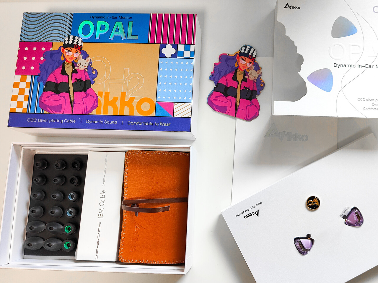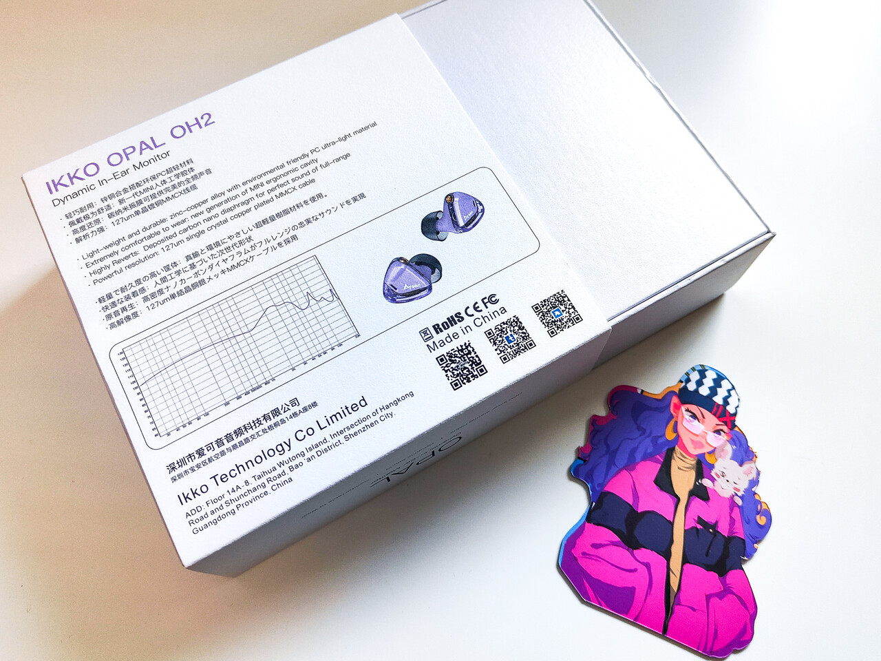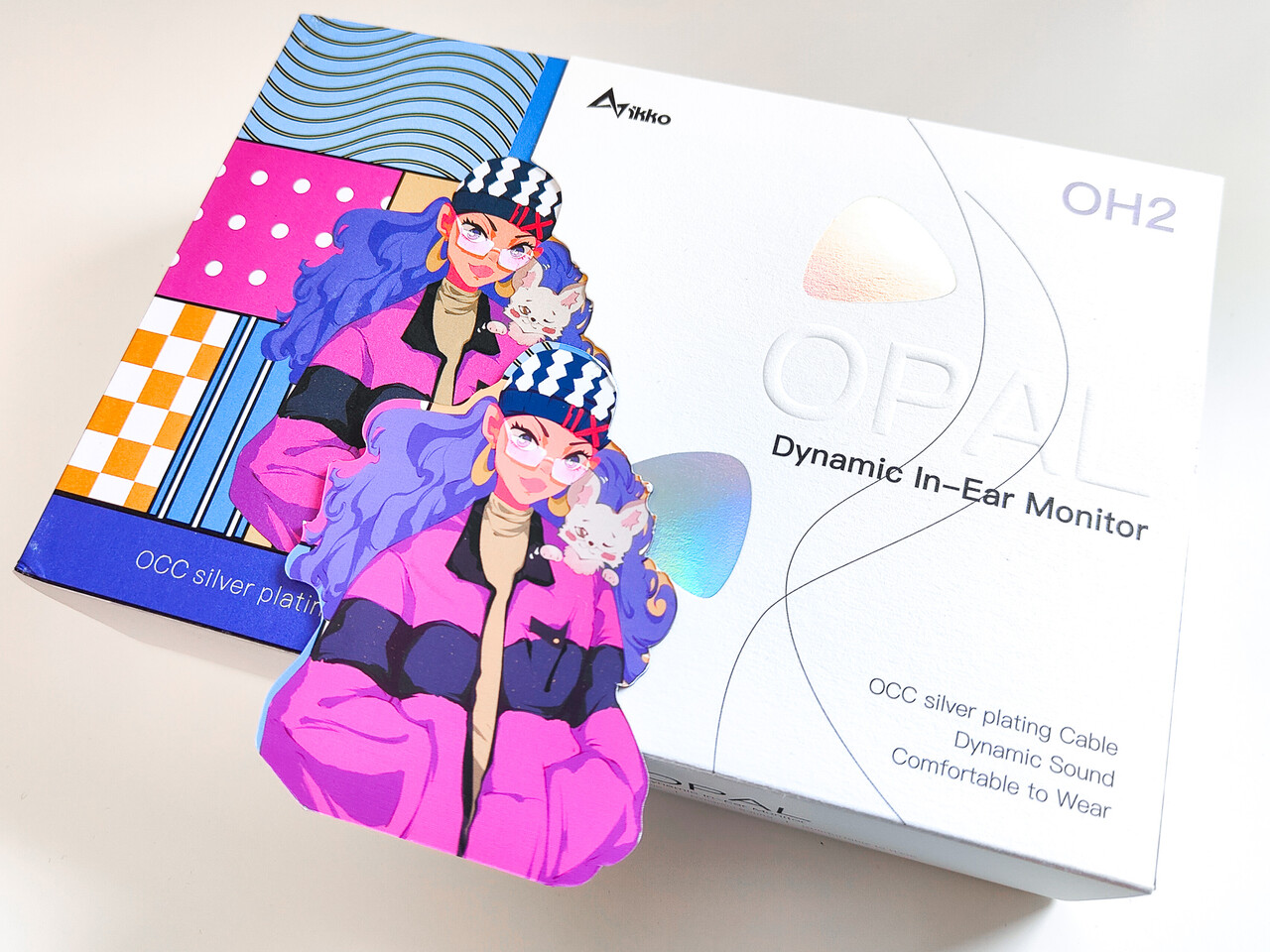 「IKKO OPAL OH2」のパッケージは低価格モデルと言うことでよりポップなデザインですが、こだわりが詰まっているところは相変わらず。化粧箱のうえからカバーをかけてあり、化粧箱に描かれたキャラクターがマグネットになってそのまま上に貼られているという。このギミック、要るのかしらん?とちょっと思ってしまうわけですが、パッケージが豪華なのもこのグレードの最近の中華イヤホンの傾向ではありますね(^^;)。