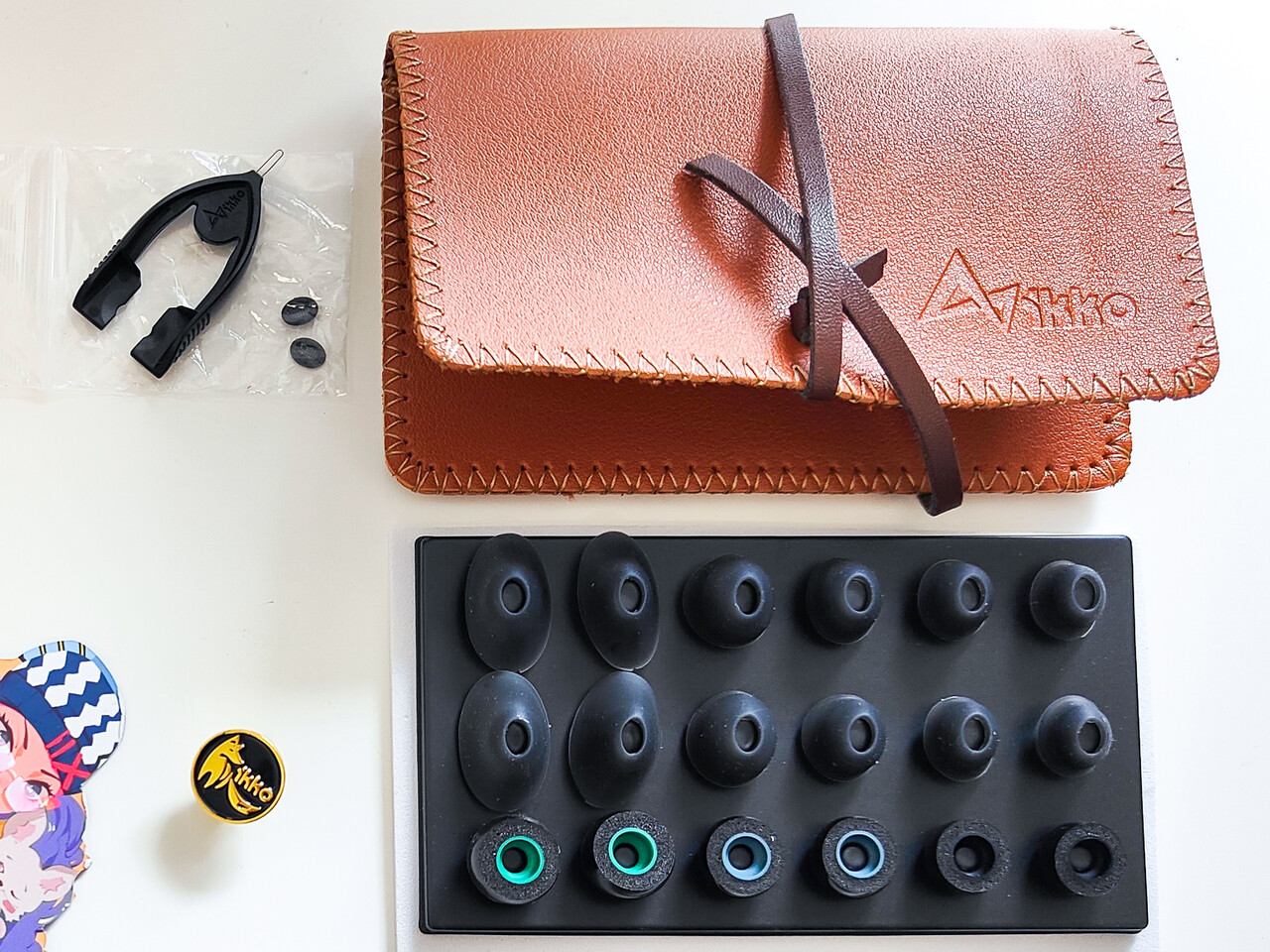 パッケージ内容は、イヤホン本体、ケーブル、イヤーピースセット(シリコン6サイズ、ウレタン3サイズ)、レザーポーチ、ピンバッジ、MMCXリムーバー&ノズルクリーナー、予備ノズルフィルター、登録カード、説明書、キャラクターマグネットシート。上位モデル同様にいろいろ入っていますね(^^)。