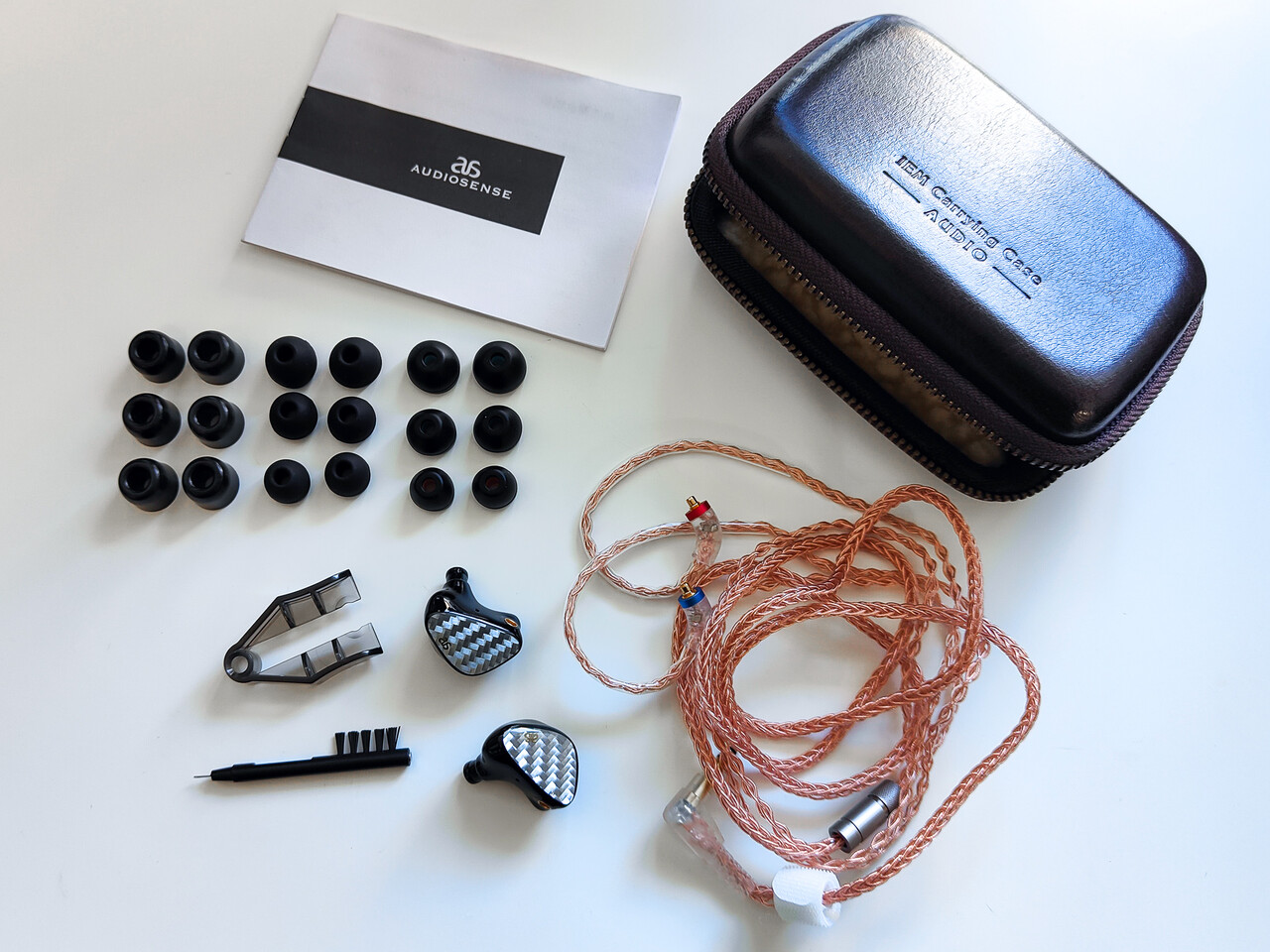 パッケージ内容はイヤホン本体、MMCXコネクタ仕様ケーブル、イヤーピース(シリコン2タイプ、S/M/Lサイズ、ウレタン3ペア)、レザーケース、クリーニングブラシ、ケーブルリムーバー、説明書。レザーケースは内側がファー生地となっており、大きさのわりに収納量は少ないものの、イヤホンに傷が付かないようにソフトに守ってくれます。