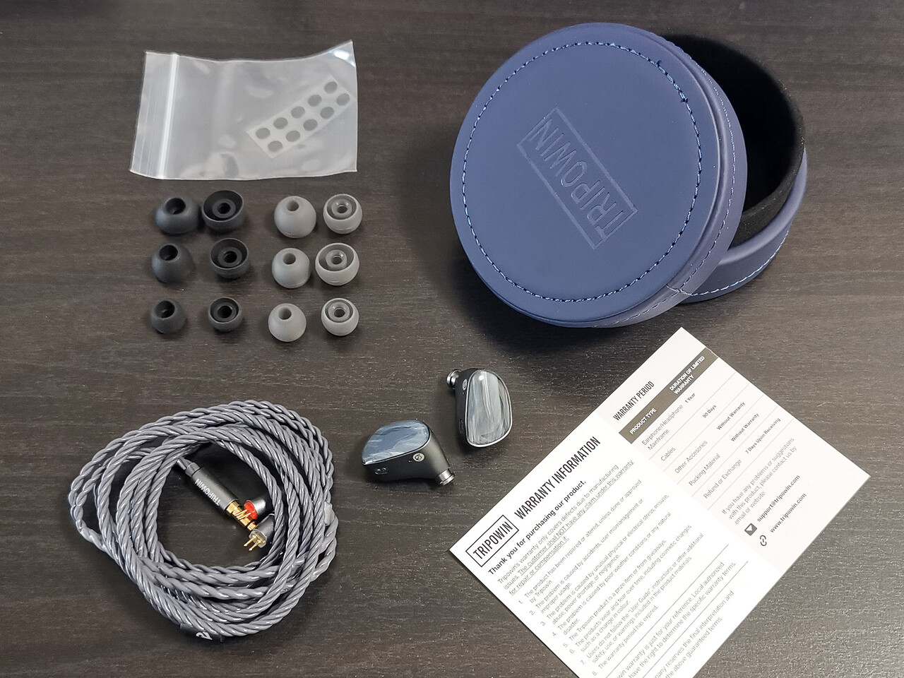 パッケージ内容は本体、ケーブル、イヤーピースはグレーとブラックの2タイプがそれぞれS/M/Lサイズ、交換用メッシュパーツ、ハードレザーケース、説明書など。レザーケースは「FAudio Scale」などのイヤホンに付属する円形タイプとよく似ており「TRIPOWIN」のロゴが刻印されています。