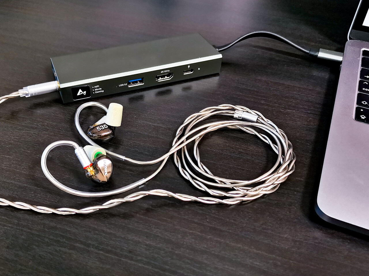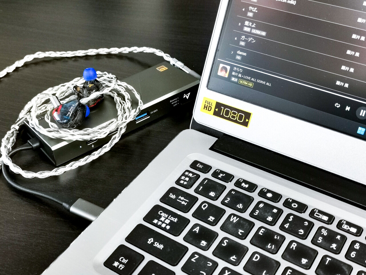 「MUSIC」(HiFi)モードの音質傾向は、若干低域寄りですが基本はニュートラルで癖の無い音を鳴らします。バランス接続とのシングルエンドの差はそれほど大きくは無く、バランスの方がややエッジが立つ程度。出力にもほとんど差はないため、通常はシングルエンドのほうが自然な音で使いやすいのではと思います。反応の良いイヤホンでもホワイトノイズなどはほとんど発生せず、極端に鳴らしにくい製品を除き大抵のイヤホンでは問題なく使えるでしょう。いっぽうで、駆動力はそれなりにありますが、出力(ゲイン)は小さめで、MacBook Proでの利用で「AKG K701(バランス化済み)」でシングルエンドでもバランスでも最大音量でギリ、くらいの印象でした。 鳴らしにくいヘッドホンではあまり向かない所もやはりモバイル向けのアイテムですね。解像感や分離性、音場の広がりなどの点で上位モデルや高音質DACには及ばないものの、「MUSIC」モードでは普段使いとしては十分に実用的な音質だと思います。また、モバイルドッキングステーション部分も問題なく利用できました。モニタについてもHDMI経由でFHDのディスプレイのほか、4Kの液晶テレビへの出力も問題ありませんでした。最近はプレゼンなどもプロジェクターよりも大画面テレビに画面を映してという機会が増えていますが特に問題はなさそうです。接続はMacBook ProおよびPC(Windows 11 Pro搭載)で試しましたがどちらも問題はありませんでした(Windows 11ではオーディオも標準ドライバーでの接続になるため、ASIOには未対応)。