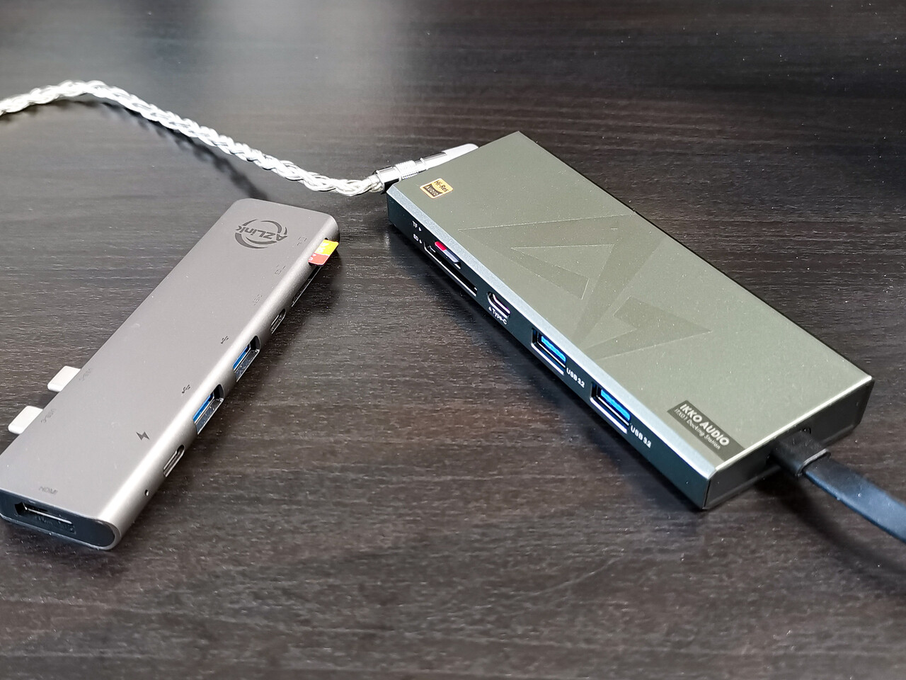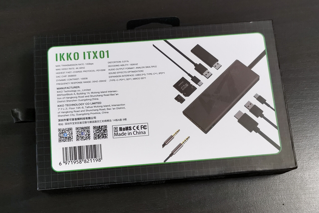 Amazonなどではこのような仕様のコンパクトなドッキングステーションは数千円で購入できることもあり、MacBookやSurfaceといったモバイルノートを持ち歩きで使用するような職業の方ならだいたい1個くらいは持っていたりするものですね。訪問先でプロジェクターやモニターにつなぐためにHDMIは必要ですし、プリンターやUSBメモリをつなぐのにタイプAのUSBも必要。そして今でもSDカードやmicroSDでのデータのやりとりや確認の機会も多い、そんな感じです。いっぽうでもともとモバイルの補助アイテムなので、Macユーザーを想定しても、高速ストレージや高リフレッシュレートの4Kモニタなどで使用されるThunderbolt3/4のような機能は必要ない、という発想ですね。今回の「IKKO ITX01」も「モバイルドッキングステーション」としての利便性を維持したDAC搭載モデルという位置づけと考えた方が良いでしょう。個人的には日常的にスタバなどでMacBook等を広げているビジネスマン諸氏には結構「刺さる」アイテムではないかなーと思ったりします。