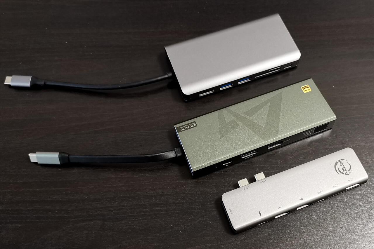Amazonなどではこのような仕様のコンパクトなドッキングステーションは数千円で購入できることもあり、MacBookやSurfaceといったモバイルノートを持ち歩きで使用するような職業の方ならだいたい1個くらいは持っていたりするものですね。訪問先でプロジェクターやモニターにつなぐためにHDMIは必要ですし、プリンターやUSBメモリをつなぐのにタイプAのUSBも必要。そして今でもSDカードやmicroSDでのデータのやりとりや確認の機会も多い、そんな感じです。いっぽうでもともとモバイルの補助アイテムなので、Macユーザーを想定しても、高速ストレージや高リフレッシュレートの4Kモニタなどで使用されるThunderbolt3/4のような機能は必要ない、という発想ですね。