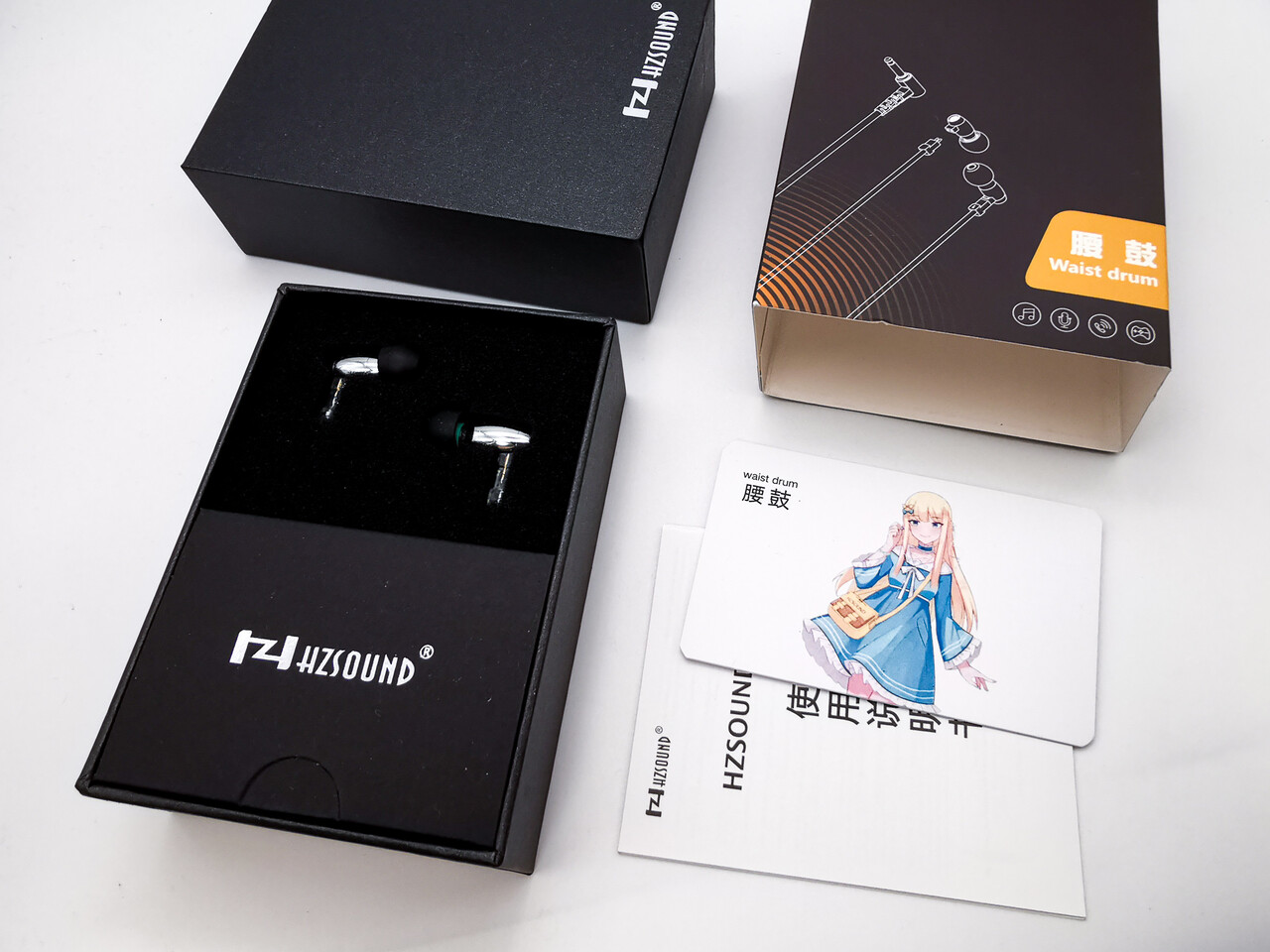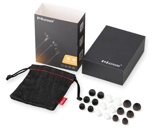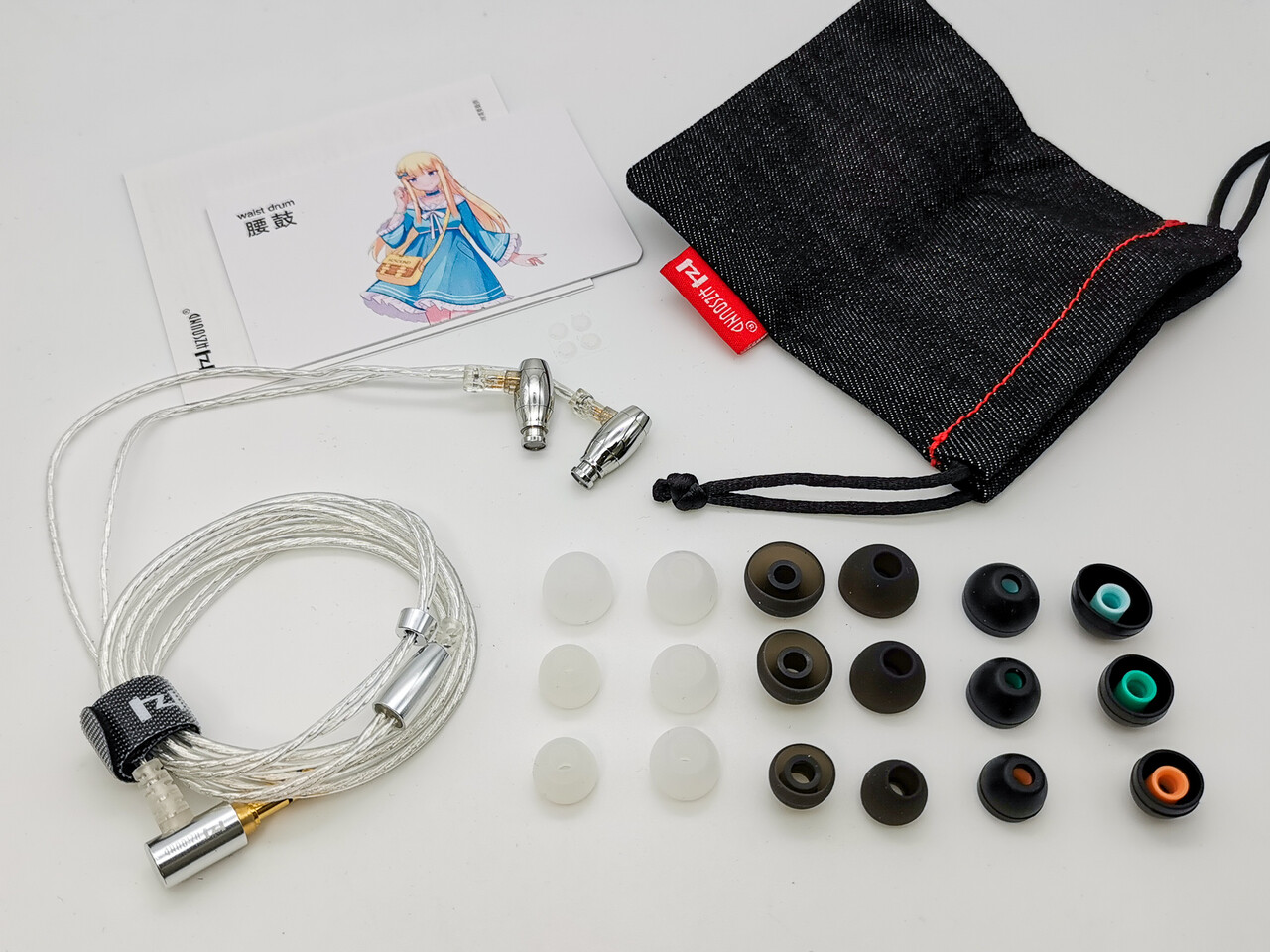 「HZSOUND Waist Drum」のパッケージは製品画像を掲載したカバーを覆った黒色のボックス。最近の同社製品と一貫性があります。パッケージ内容はイヤホン本体(ケーブル装着済み)、イヤーピースが3種類(ソニー風の黒色タイプ、開口部の広いグレータイプ、一般的な形状の白色タイプ)でそれぞれS/M/Lサイズ、交換用フィルター(2ペア)、布製のポーチ、説明書、キャラクターイラストが掲載されたカード。低価格イヤホンとしては今回もなかなか充実したパッケージ内容ですね。