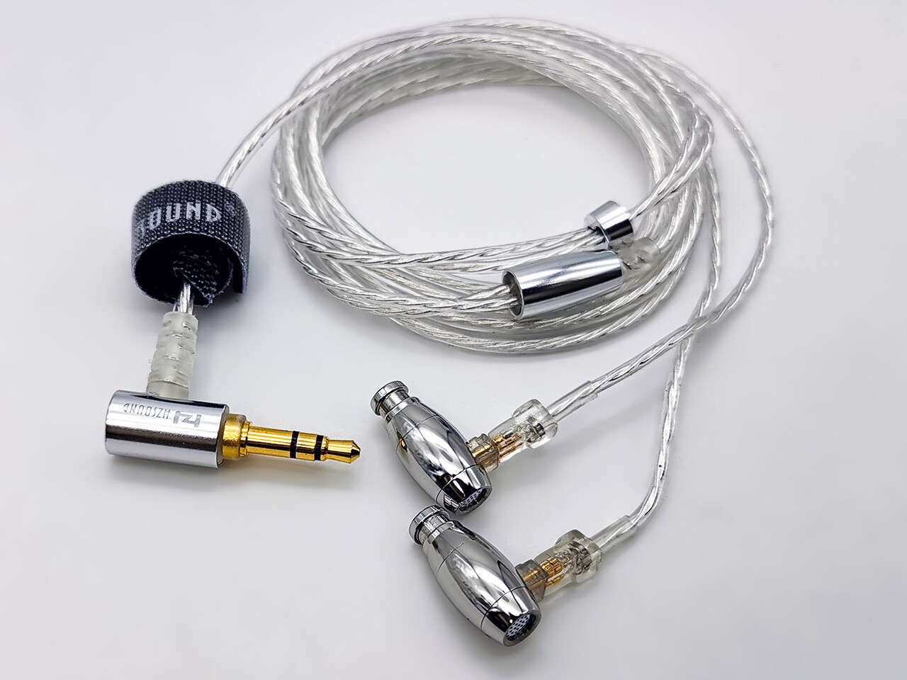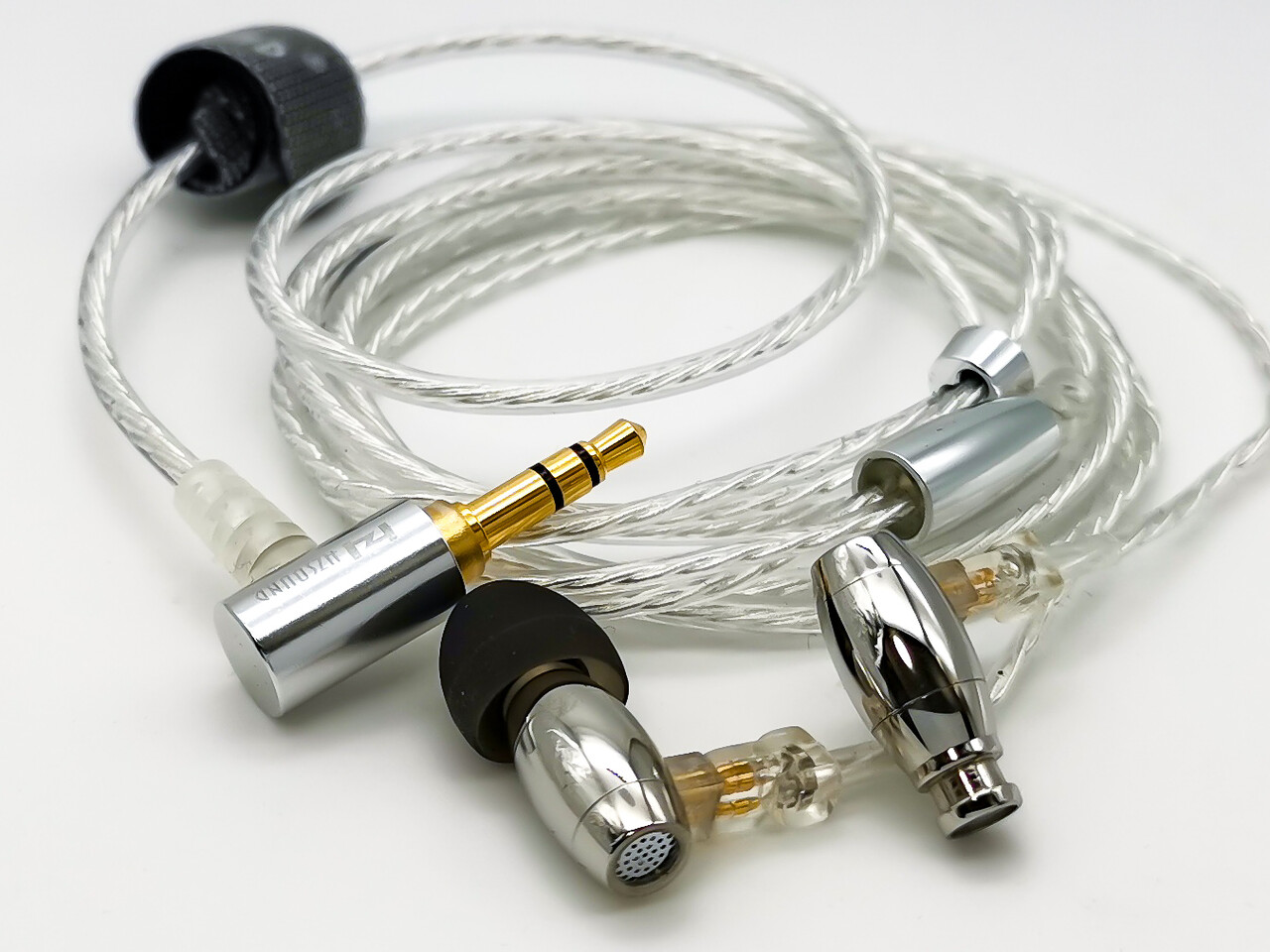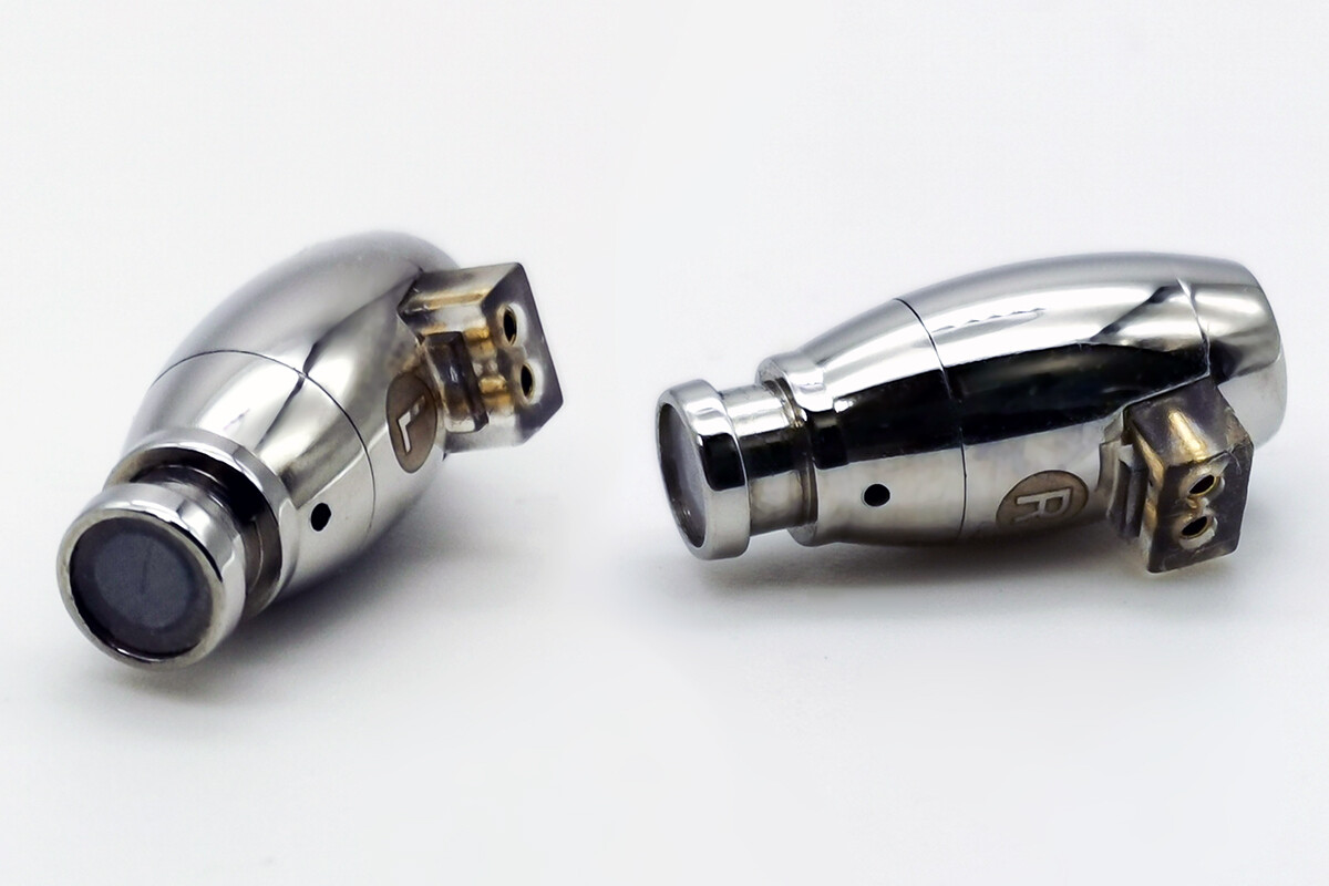 「HZSOUND Waist Drum」の本体は鏡面仕上げのステンレス製で非常にコンパクトな円筒状の形状です。形状的には弾丸型、というよりボーリングのピンに近いかな、という感じ。左右の形状は同じですが本体に「R」「L」のプリントがあるためケーブルを外した際も再装着でも迷うことはないでしょう。ちなみに形状的には某finalのイヤホンによく似ているような気がしなくもないです(^^;)。そういえば同社の代表モデルとなった「Heart Mirror」も「KXXSぽい」と言われながらも特に耳にフィットする背面部分の形状はfinal製のBシリーズやA8000あたりを彷彿とさせるものがありましたね。表面処理など仕上がりはとても丁寧で上品な印象のあるイヤホンです。